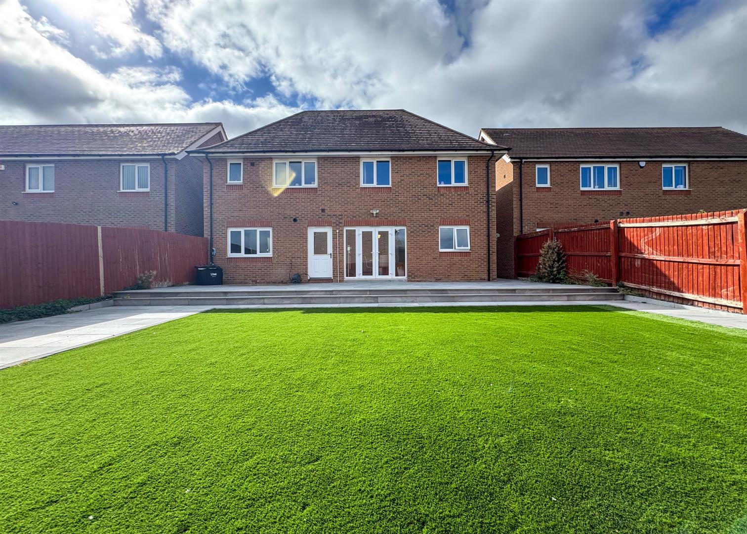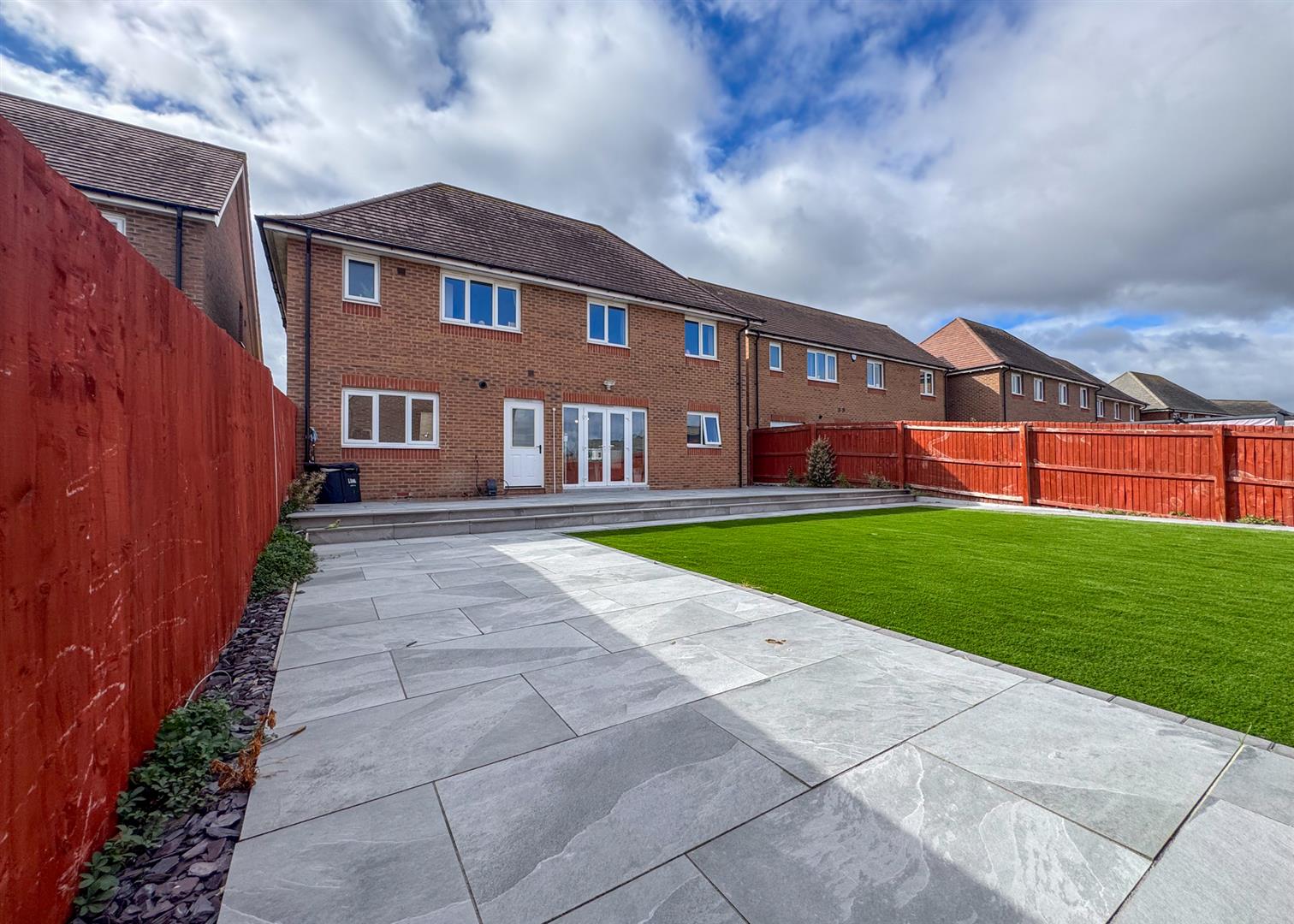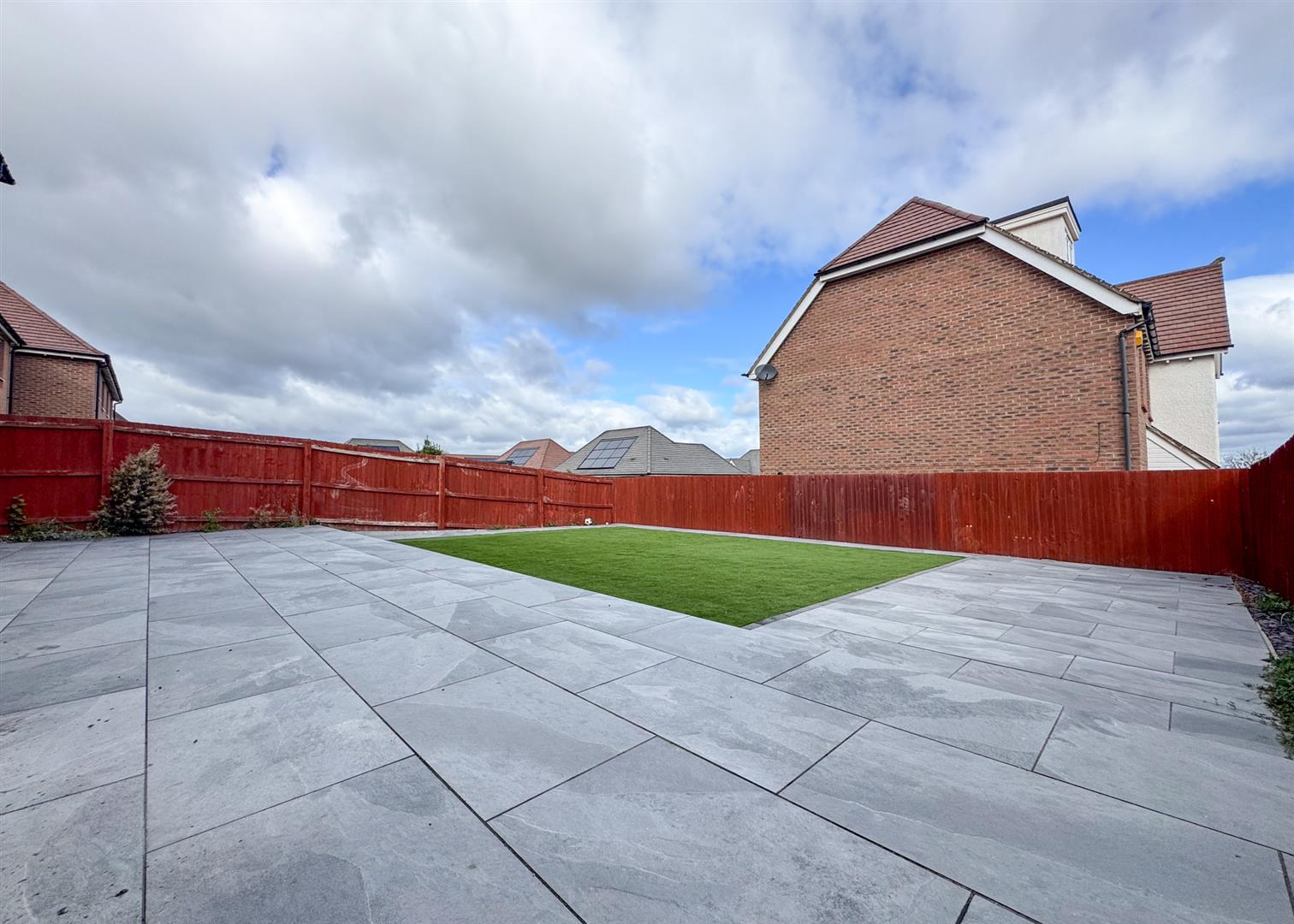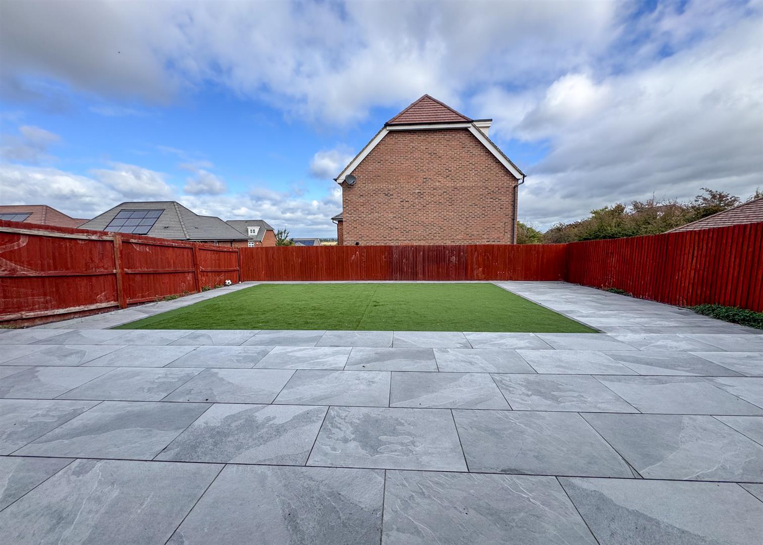 The exterior has been landscaped with ease of maintenance in mind. A generous porcelain patio provides the ideal setting for summer barbecues and outdoor entertaining, while the central astroturf lawn delivers year-round greenery with minimal upkeep. To the rear, the garden enjoys a private outlook with open field views, creating a sense of space and connection to the surrounding countryside.