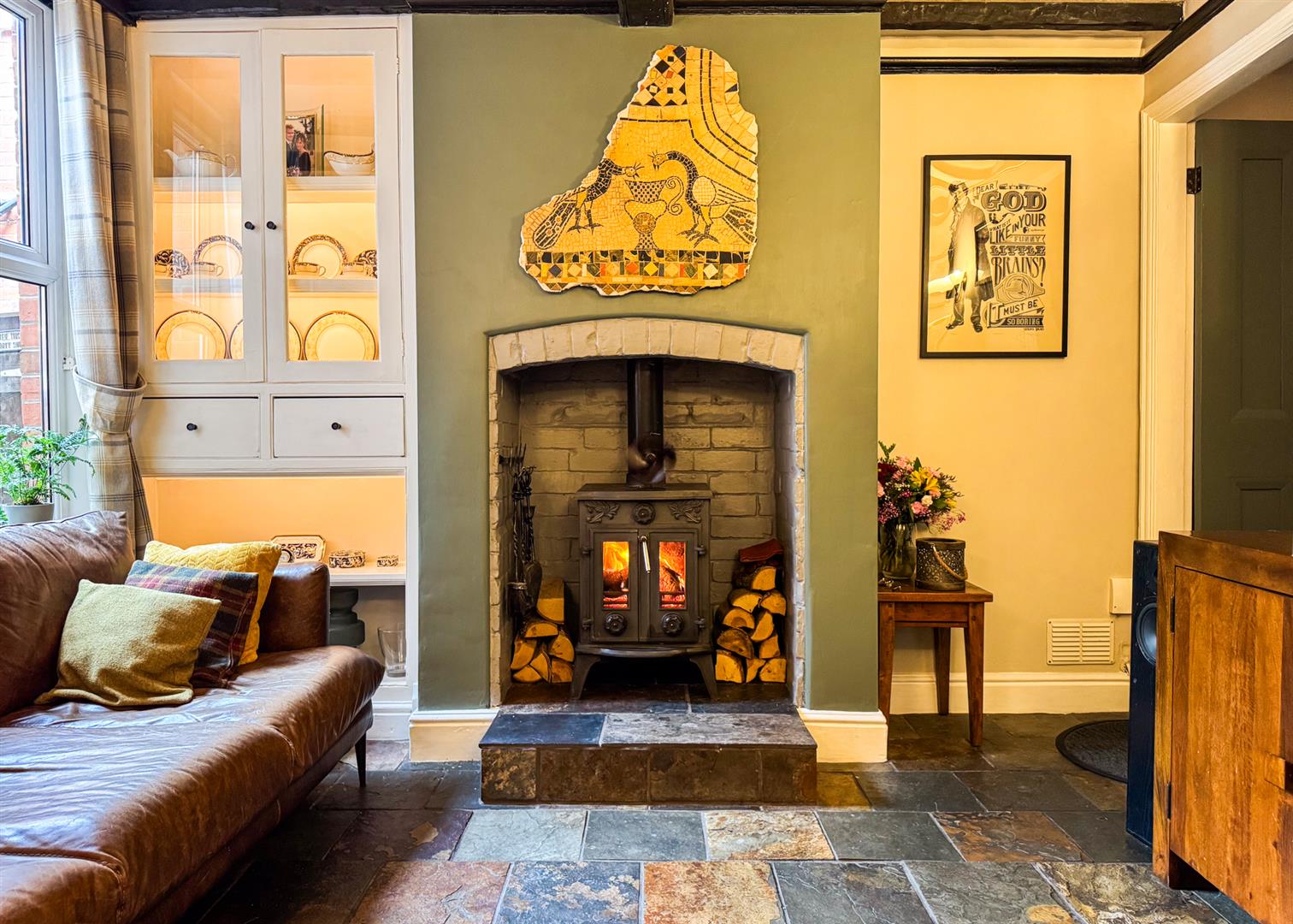 Stepping inside, the sense of history is immediately tangible. The front reception room sets a welcoming tone with rich timber floors and feature fireplace — a space that effortlessly combines cottage charm with modern comfort. Beyond this, the second reception room offers a cosy snug lounge, centred around a log-burning stove set within an exposed brick hearth — the perfect retreat on cooler evenings.