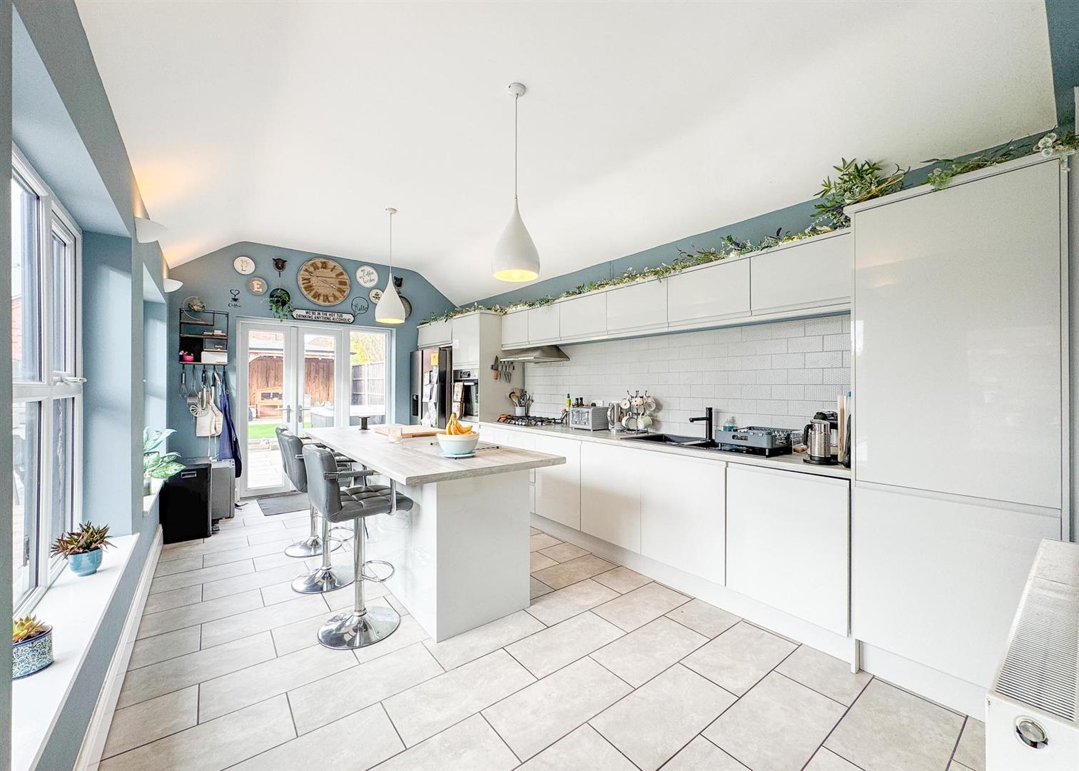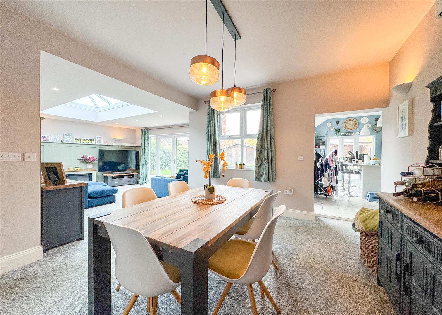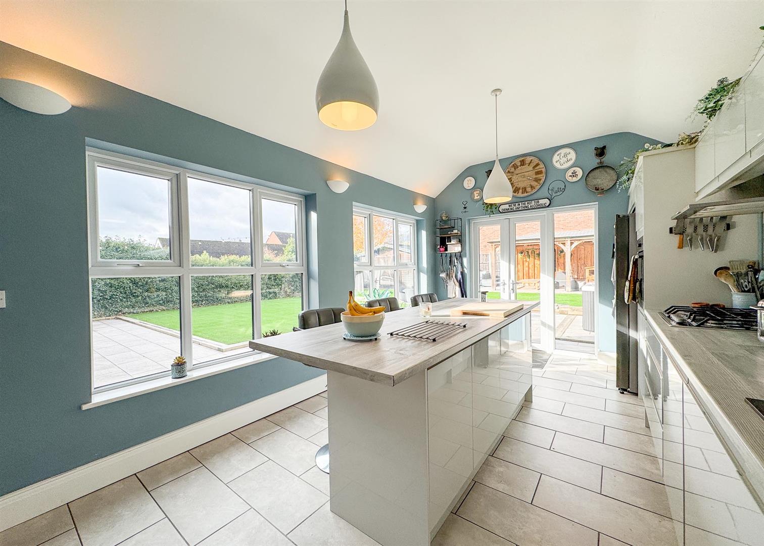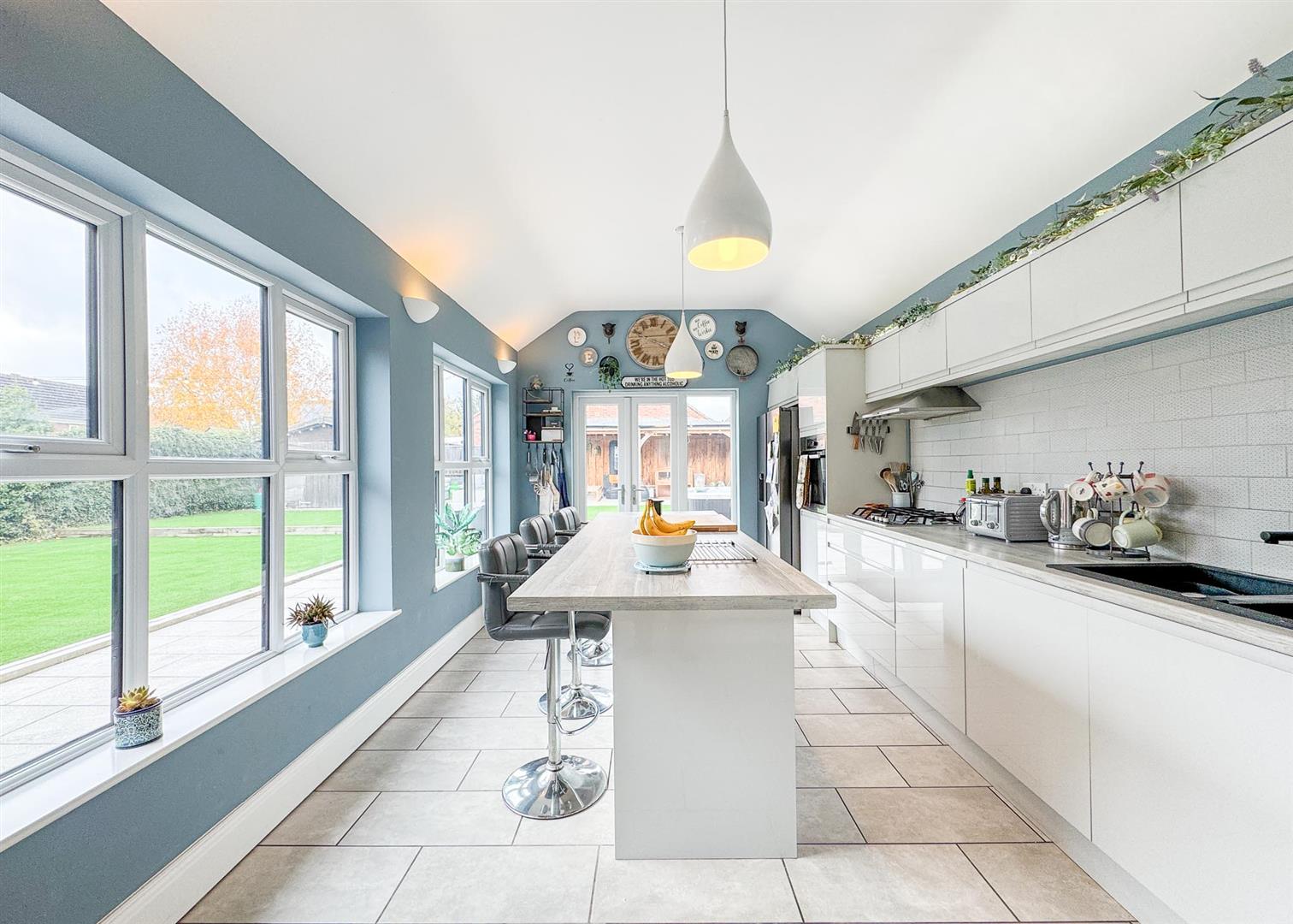 The adjoining kitchen-diner continues the theme of quality and space, showcasing an extensive range of fitted units, integrated appliances, and a central island with breakfast bar. Designed for both everyday family life and entertaining, this room enjoys abundant natural light through dual aspect windows and patio doors leading directly to the garden.