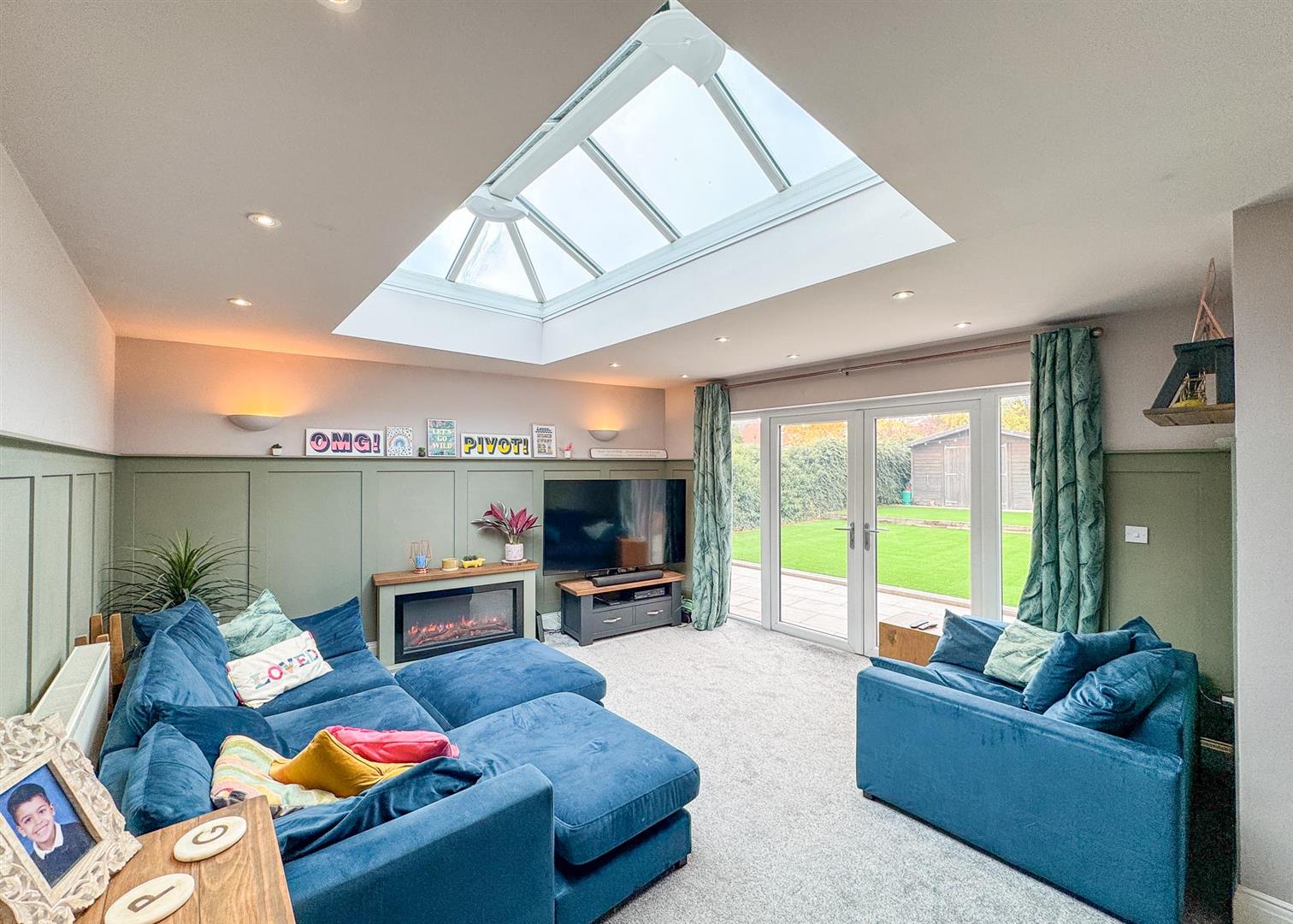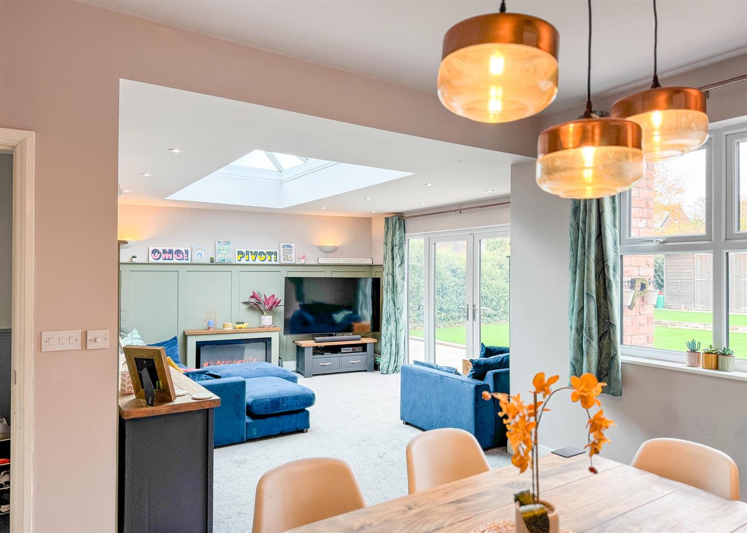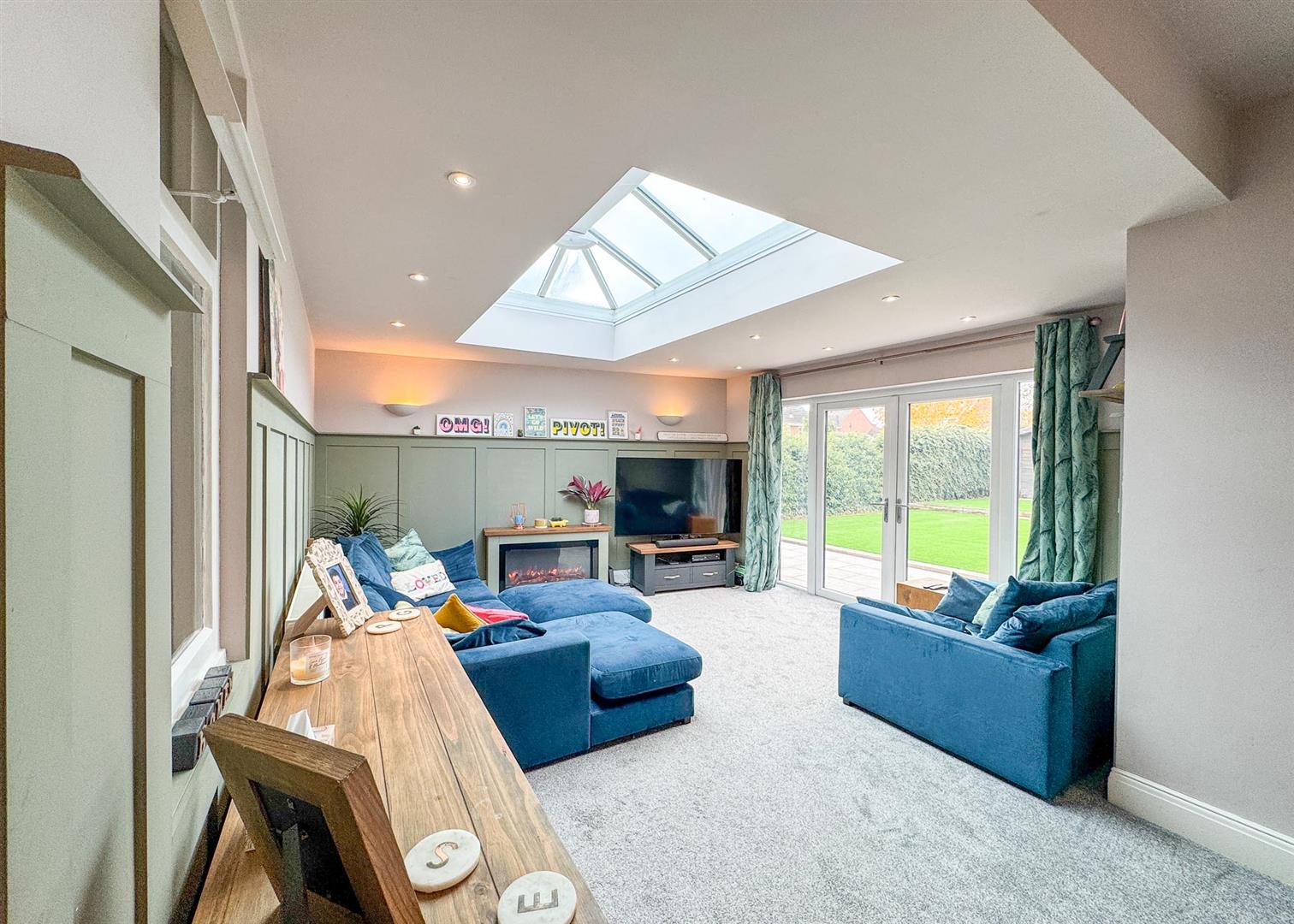 Stepping inside, a solid oak door opens to a welcoming hallway that sets the tone for the home’s warmth and character, featuring a mix of traditional detailing and contemporary style. The ground floor hosts three generous double bedrooms, each bright and well-proportioned, complemented by a sleek, fully tiled shower room with a modern white suite and chrome fixtures. To the rear, the extension creates a striking open-plan lounge and dining area—a versatile, light-filled hub with a large skylight, elegant wall panelling, and French doors opening onto the garden.
