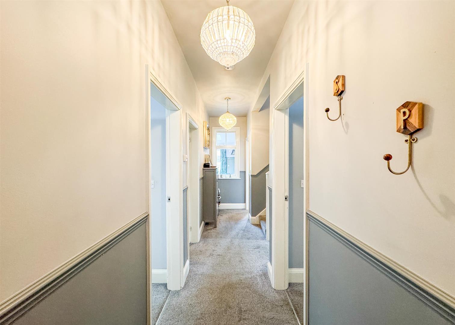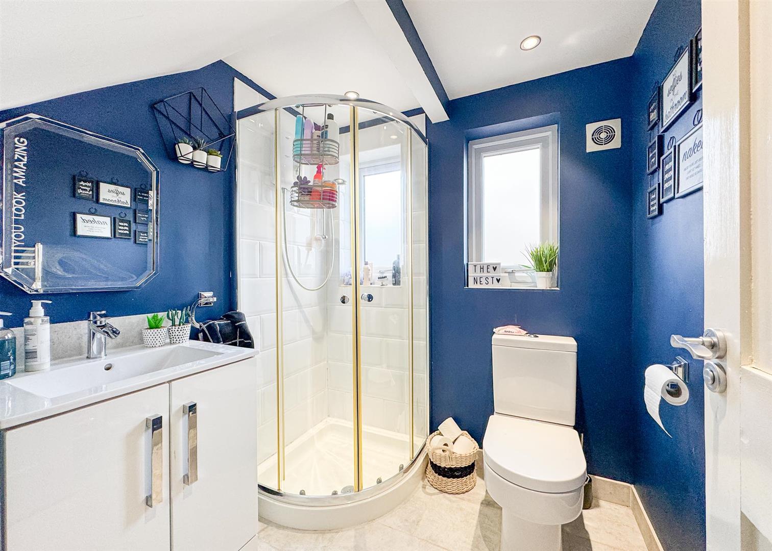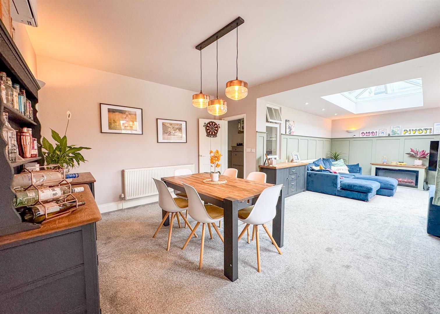Stepping inside, a solid oak door opens to a welcoming hallway that sets the tone for the home’s warmth and character, featuring a mix of traditional detailing and contemporary style. The ground floor hosts three generous double bedrooms, each bright and well-proportioned, complemented by a sleek, fully tiled shower room with a modern white suite and chrome fixtures. To the rear, the extension creates a striking open-plan lounge and dining area—a versatile, light-filled hub with a large skylight, elegant wall panelling, and French doors opening onto the garden.
