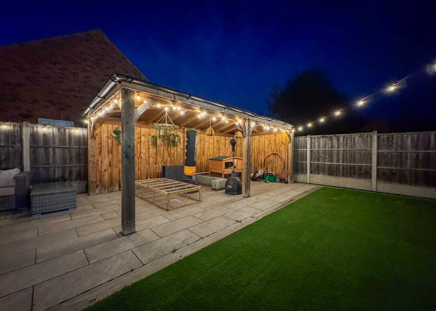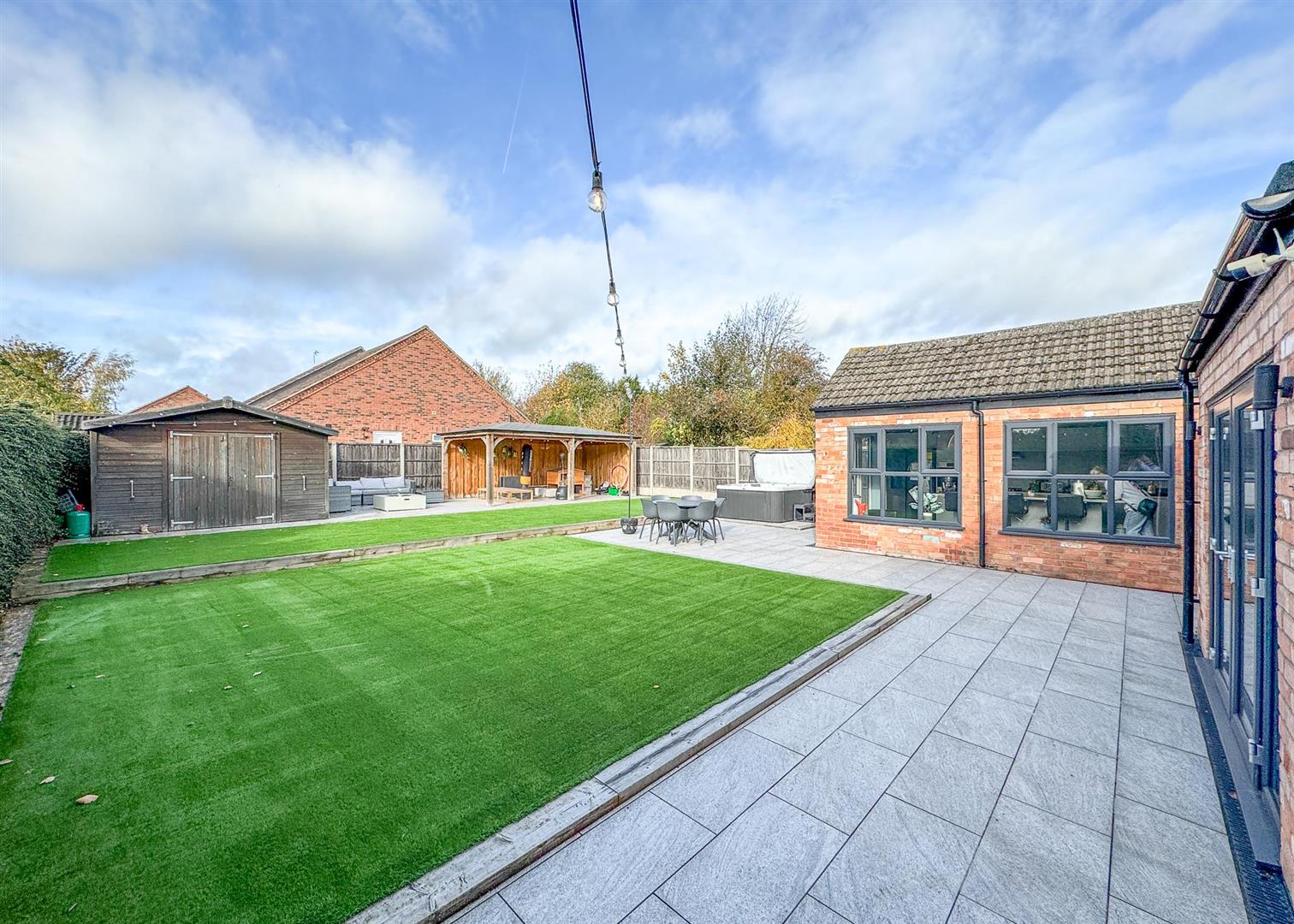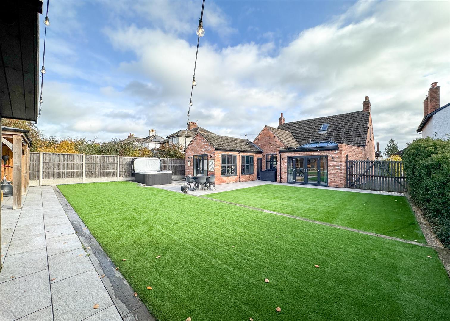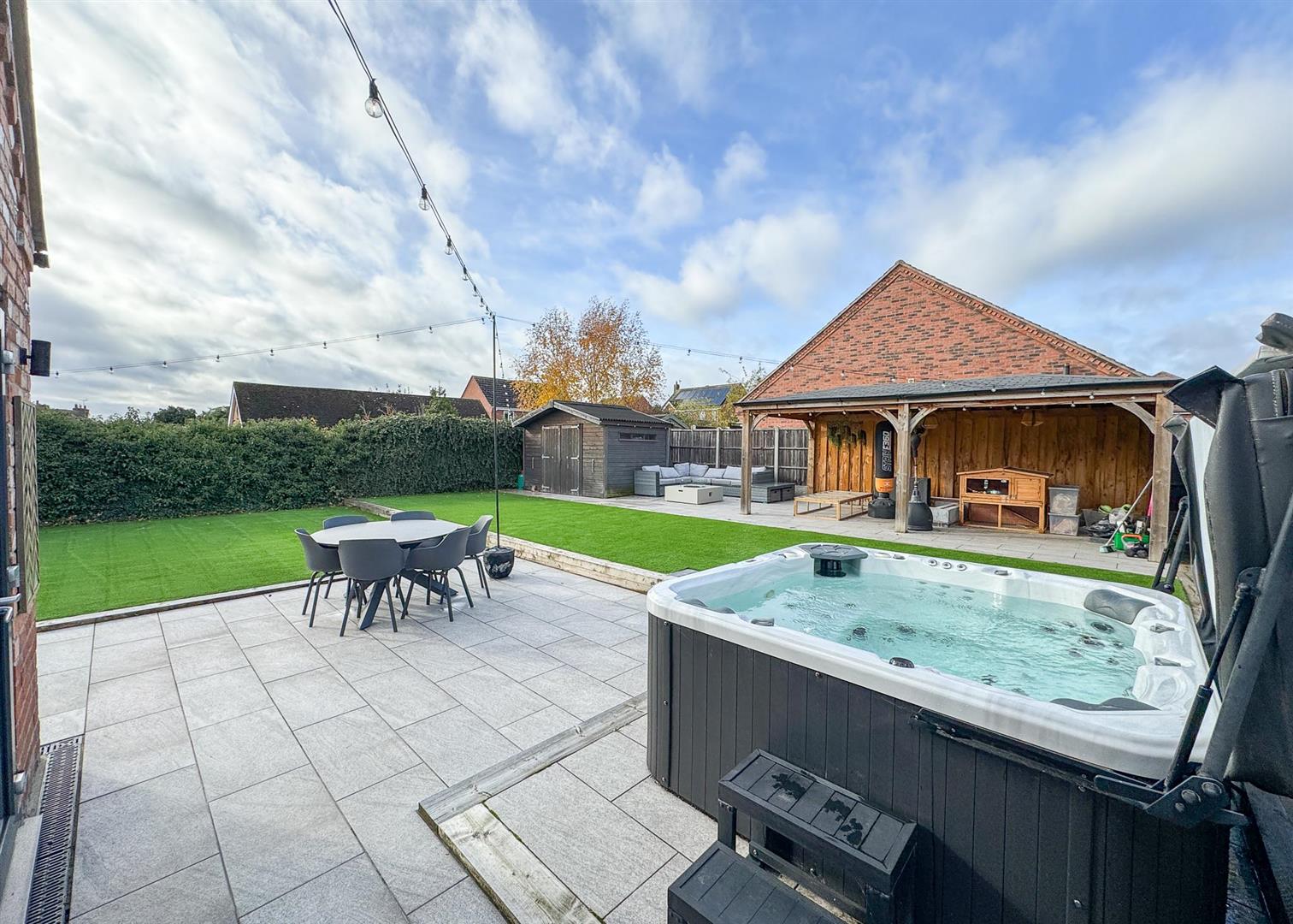 Outside, the landscaped rear garden is a private oasis with two tiled patio areas, artificial lawns framed by sleeper borders, and a timber pergola with seating and firepit—perfect for summer evenings. A solid timber workshop adds practicality, while the gated driveway to the front provides ample off-road parking bordered by reclaimed brickwork, wall lighting, and mature planting.