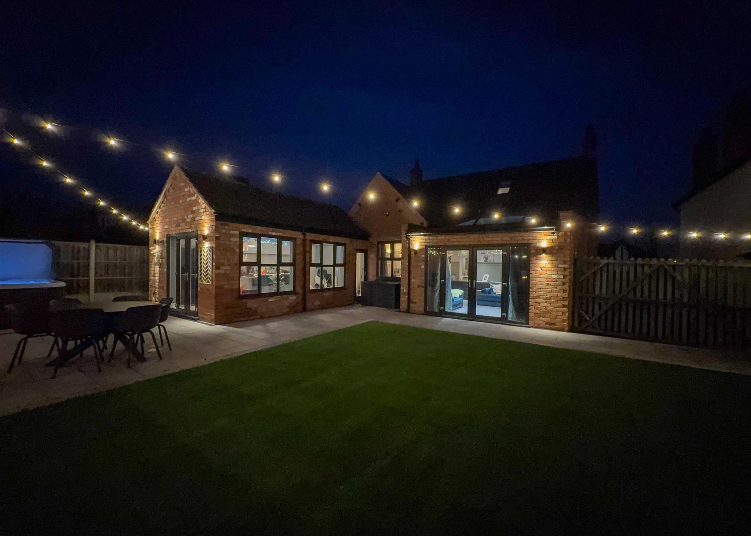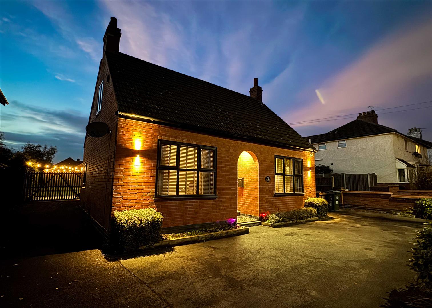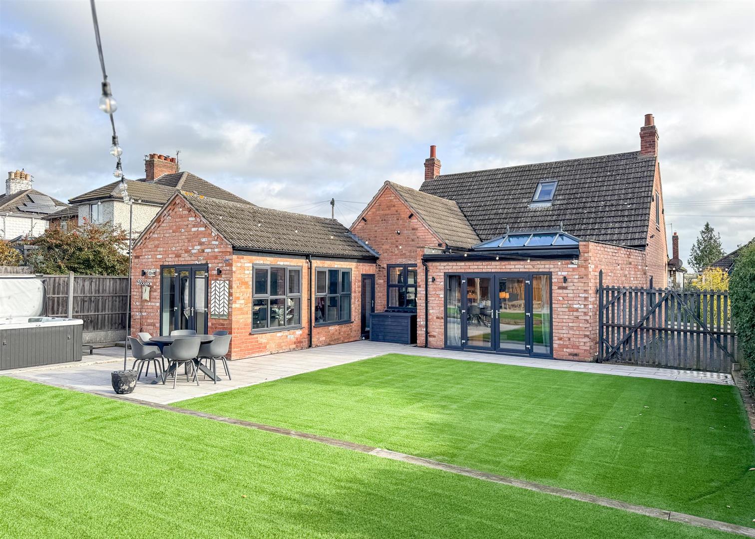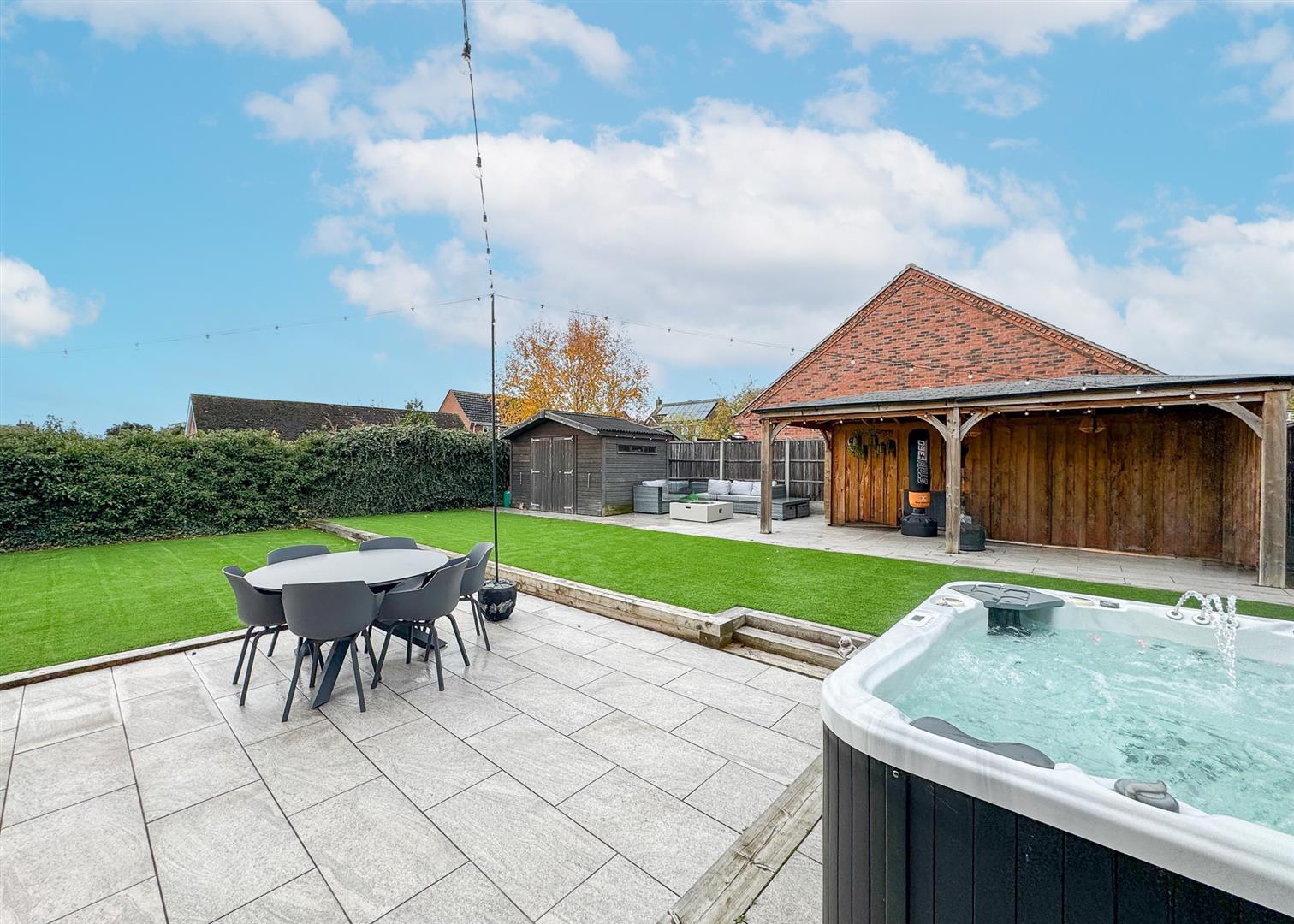 Outside, the landscaped rear garden is a private oasis with two tiled patio areas, artificial lawns framed by sleeper borders, and a timber pergola with seating and firepit—perfect for summer evenings. A solid timber workshop adds practicality, while the gated driveway to the front provides ample off-road parking bordered by reclaimed brickwork, wall lighting, and mature planting.