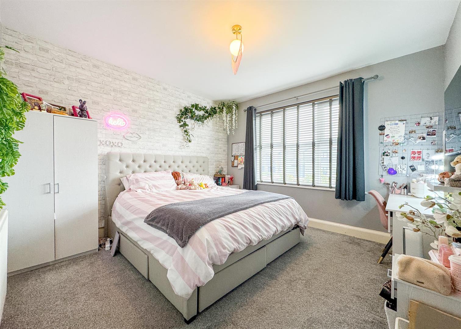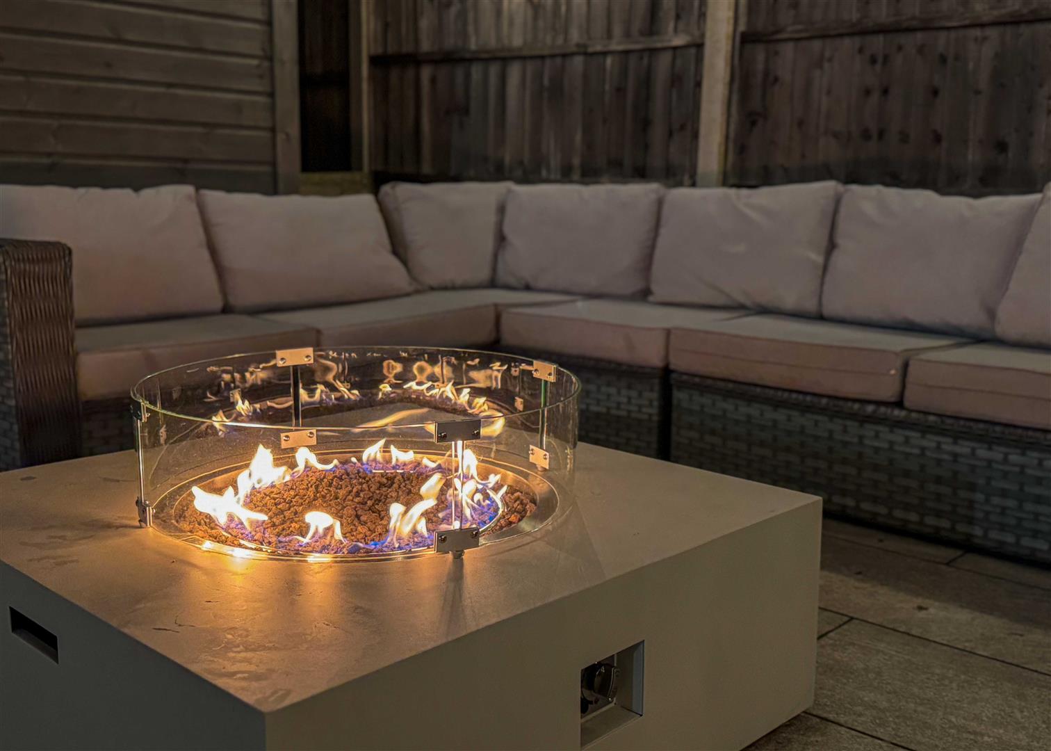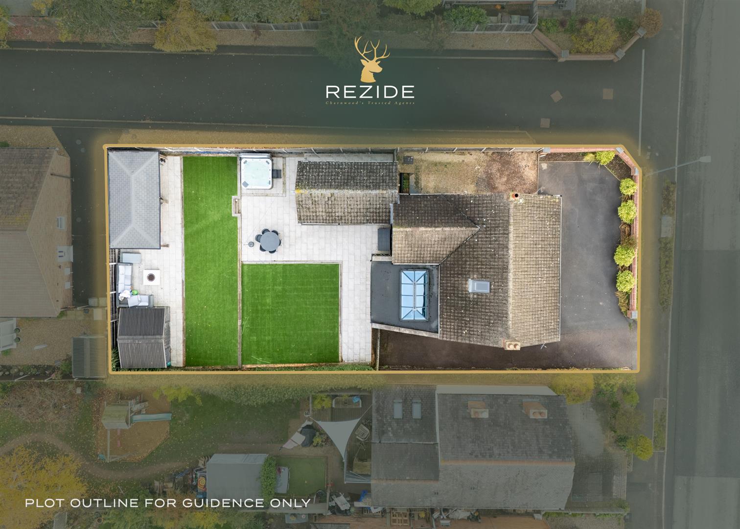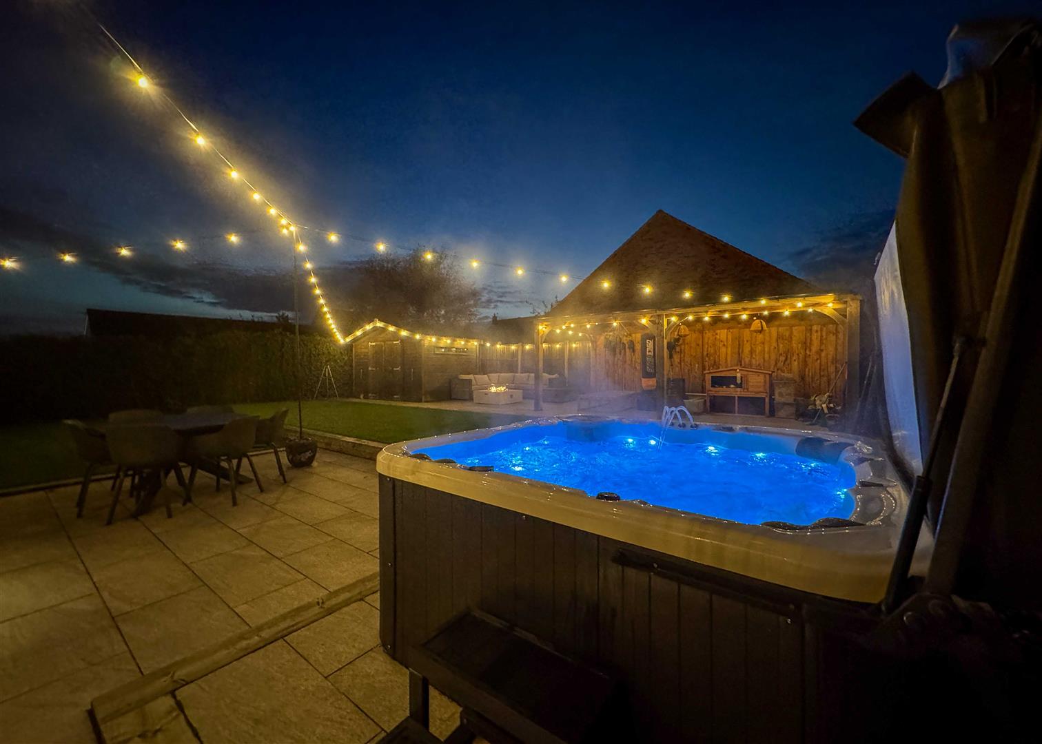 Outside, the landscaped rear garden is a private oasis with two tiled patio areas, artificial lawns framed by sleeper borders, and a timber pergola with seating and firepit—perfect for summer evenings. A solid timber workshop adds practicality, while the gated driveway to the front provides ample off-road parking bordered by reclaimed brickwork, wall lighting, and mature planting.