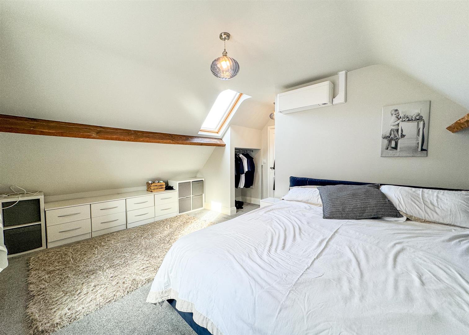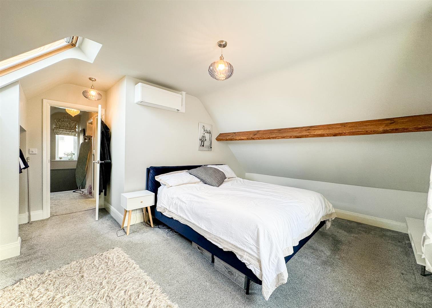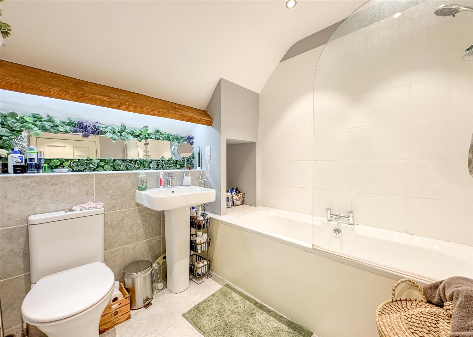 Upstairs, the home offers two further bedrooms and a stylish family bathroom. The principal bedroom is a generous retreat featuring exposed timber beams, a skylight, and charming views, while the additional room—currently used as a dressing room—would also make for an excellent study or creche . The upstairs bathroom is tastefully appointed, complete with a shower-over-bath, tiled surrounds, and a heated towel rail, continuing the home’s cohesive, modern finish.