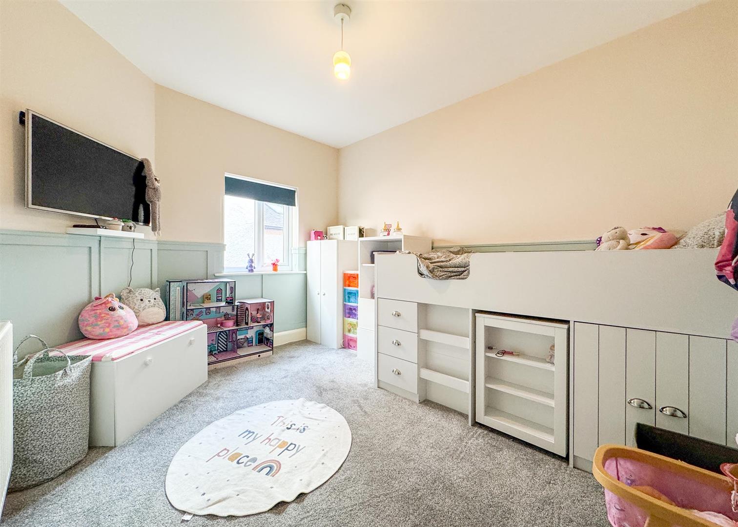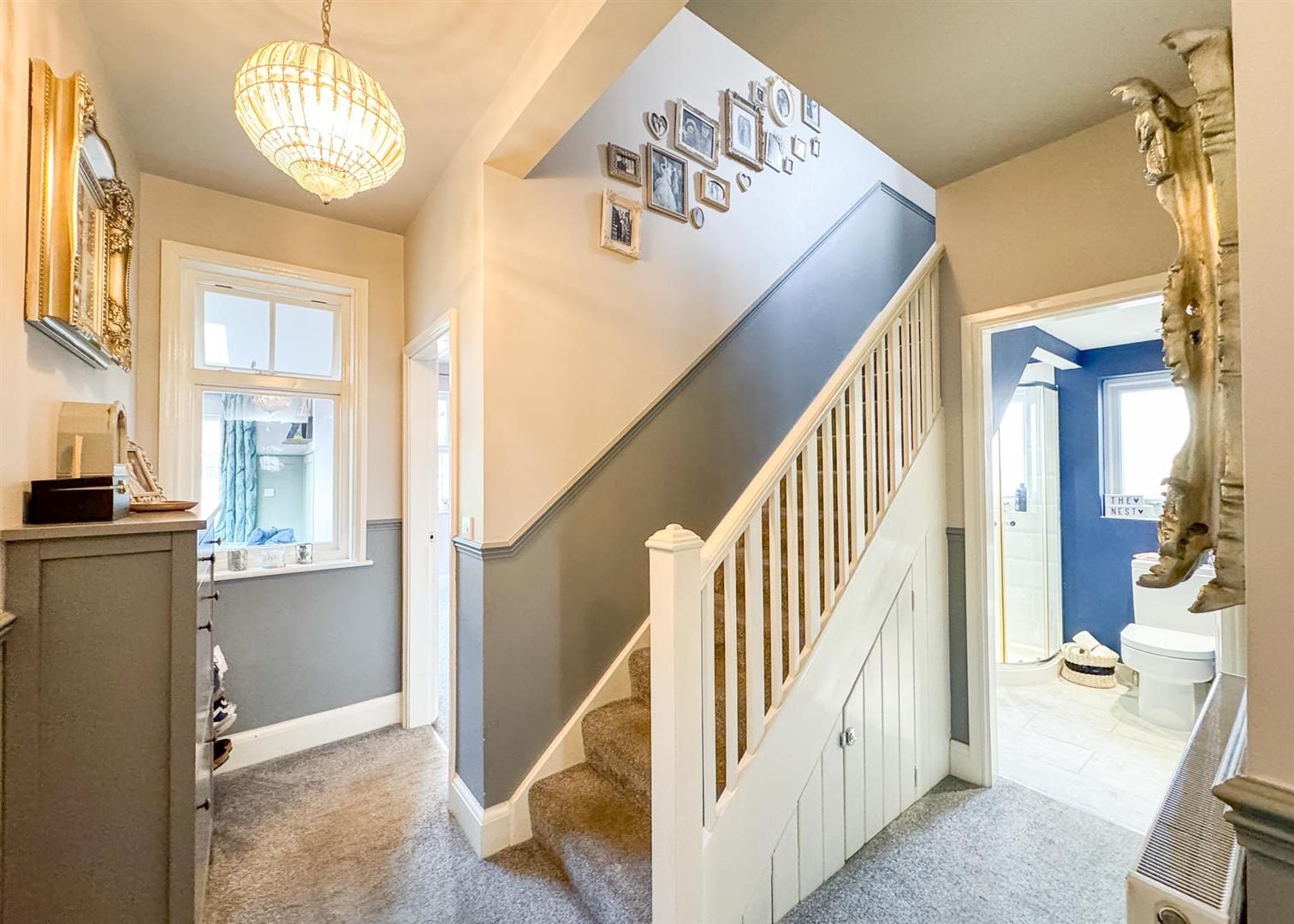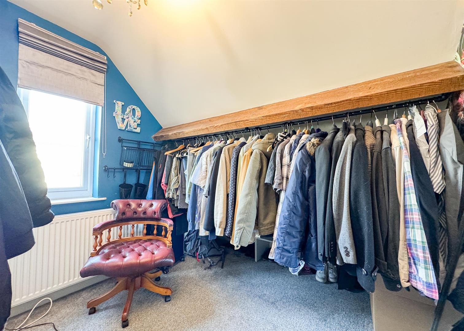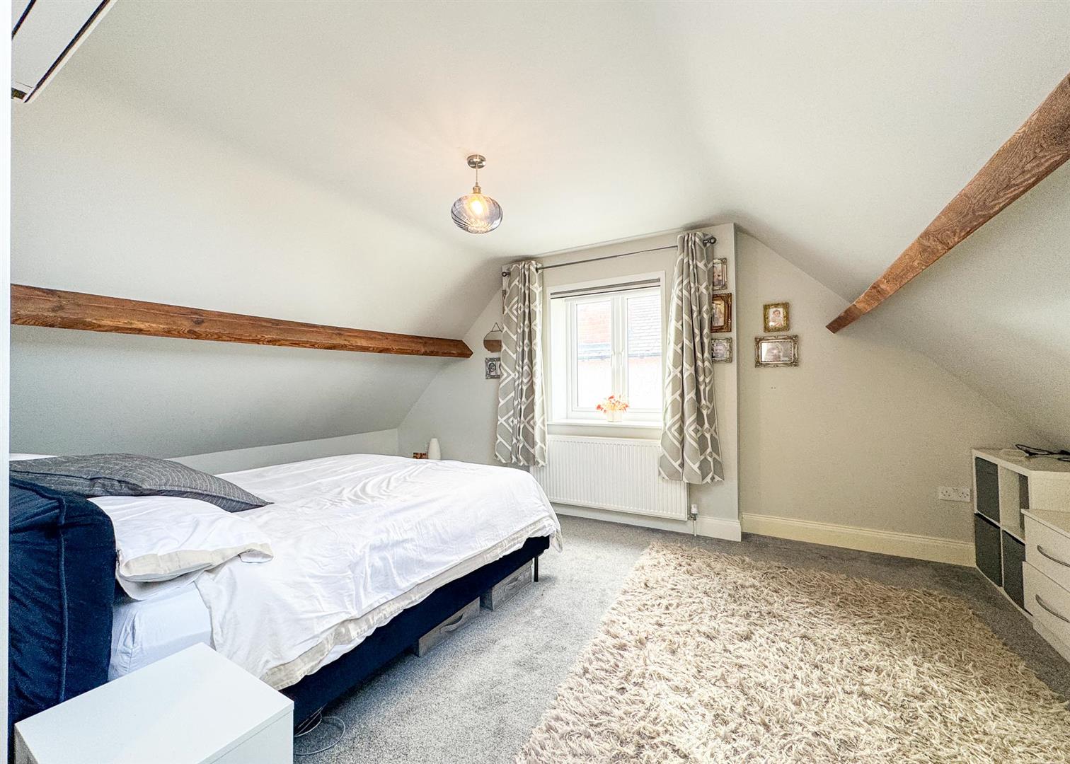 Upstairs, the home offers two further bedrooms and a stylish family bathroom. The principal bedroom is a generous retreat featuring exposed timber beams, a skylight, and charming views, while the additional room—currently used as a dressing room—would also make for an excellent study or creche . The upstairs bathroom is tastefully appointed, complete with a shower-over-bath, tiled surrounds, and a heated towel rail, continuing the home’s cohesive, modern finish.