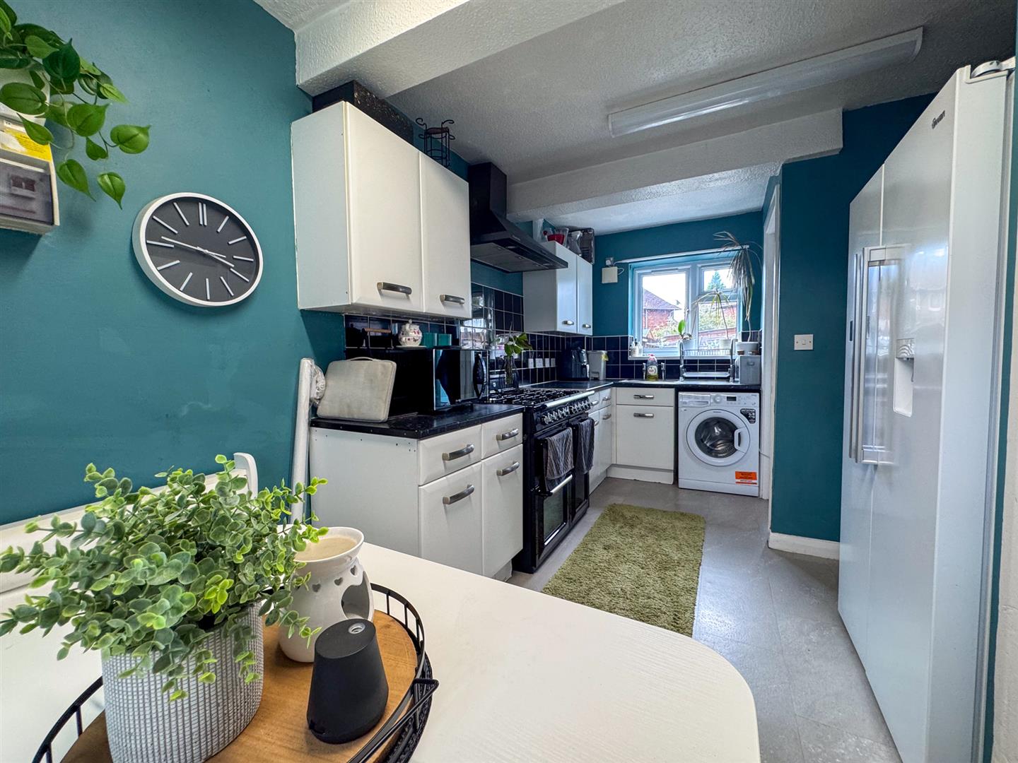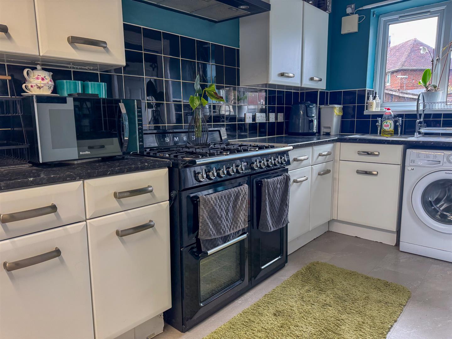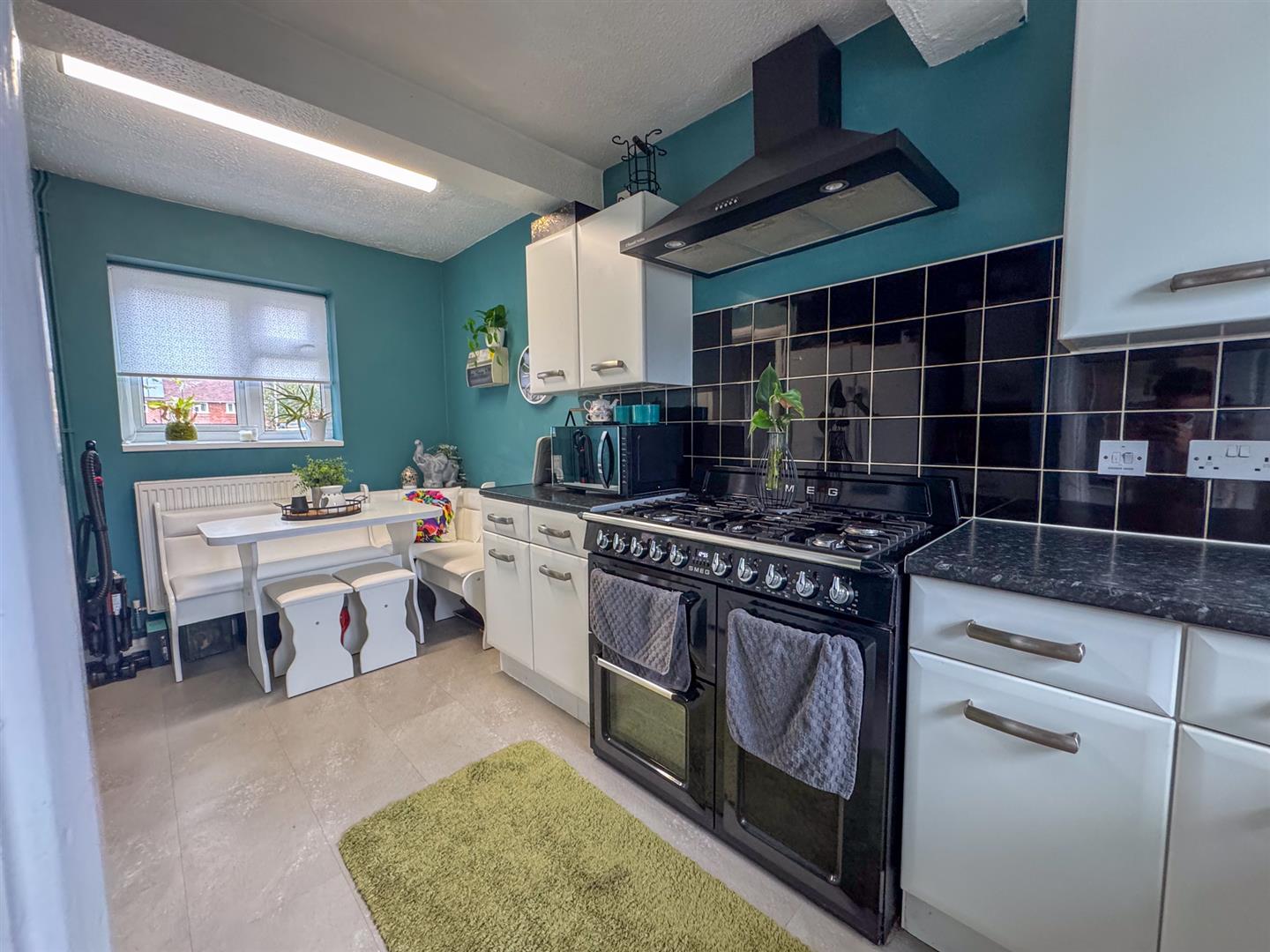 On the left, the kitchen-dining space is fitted with a range of wall and base units, complemented by contrasting work surfaces. The kitchen further features a freestanding Smeg gas range cooker, stainless steel sink with drainer overlooking the garden, and space for appliances. A rear lobby provides access to a ground floor WC, adding everyday convenience.