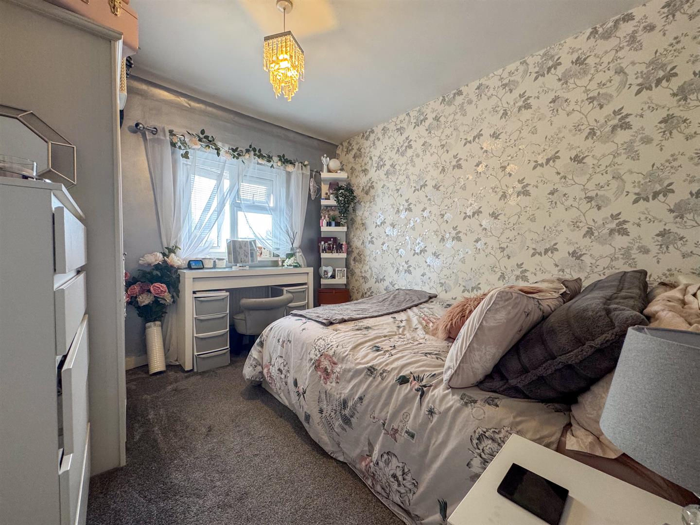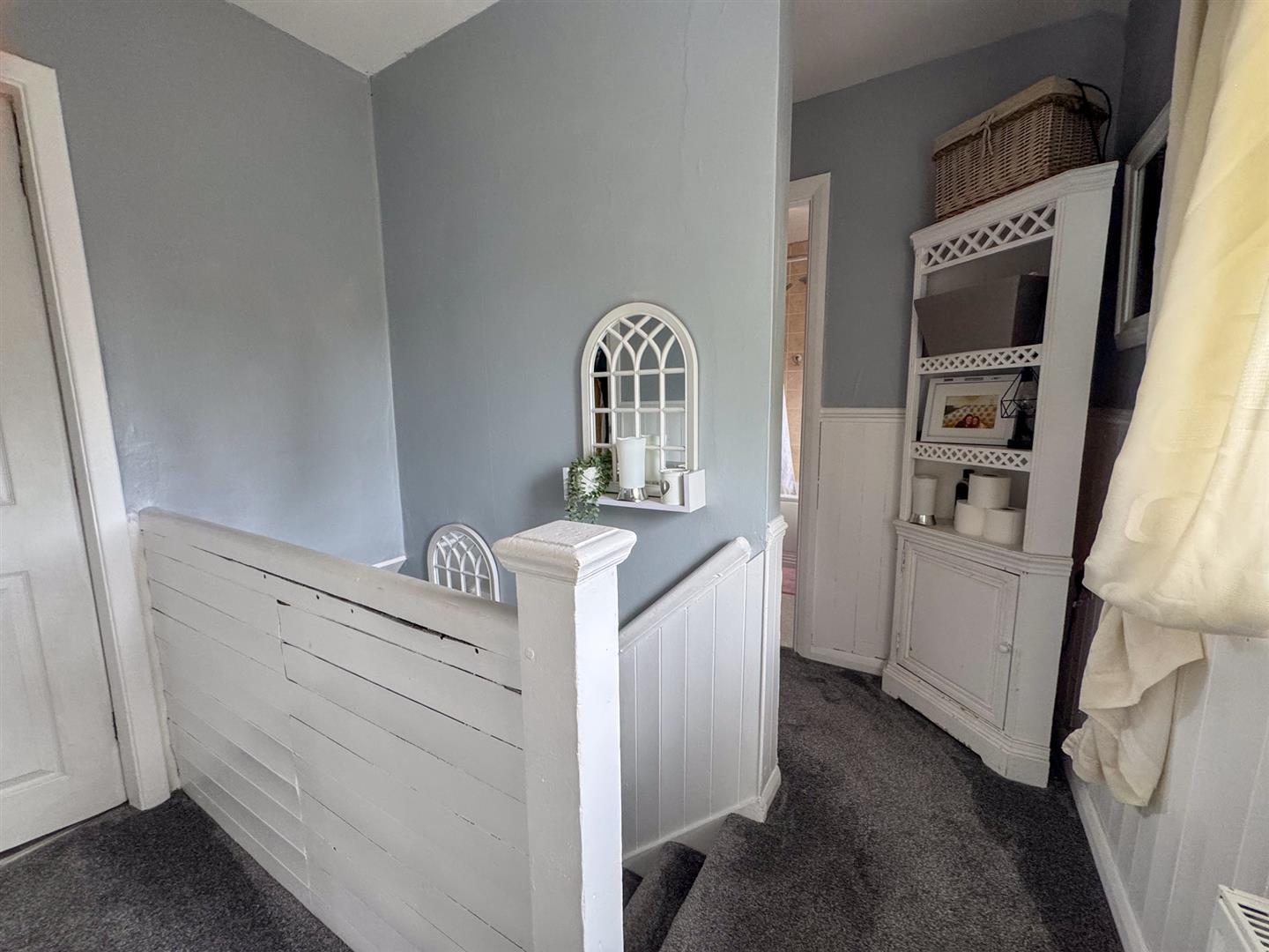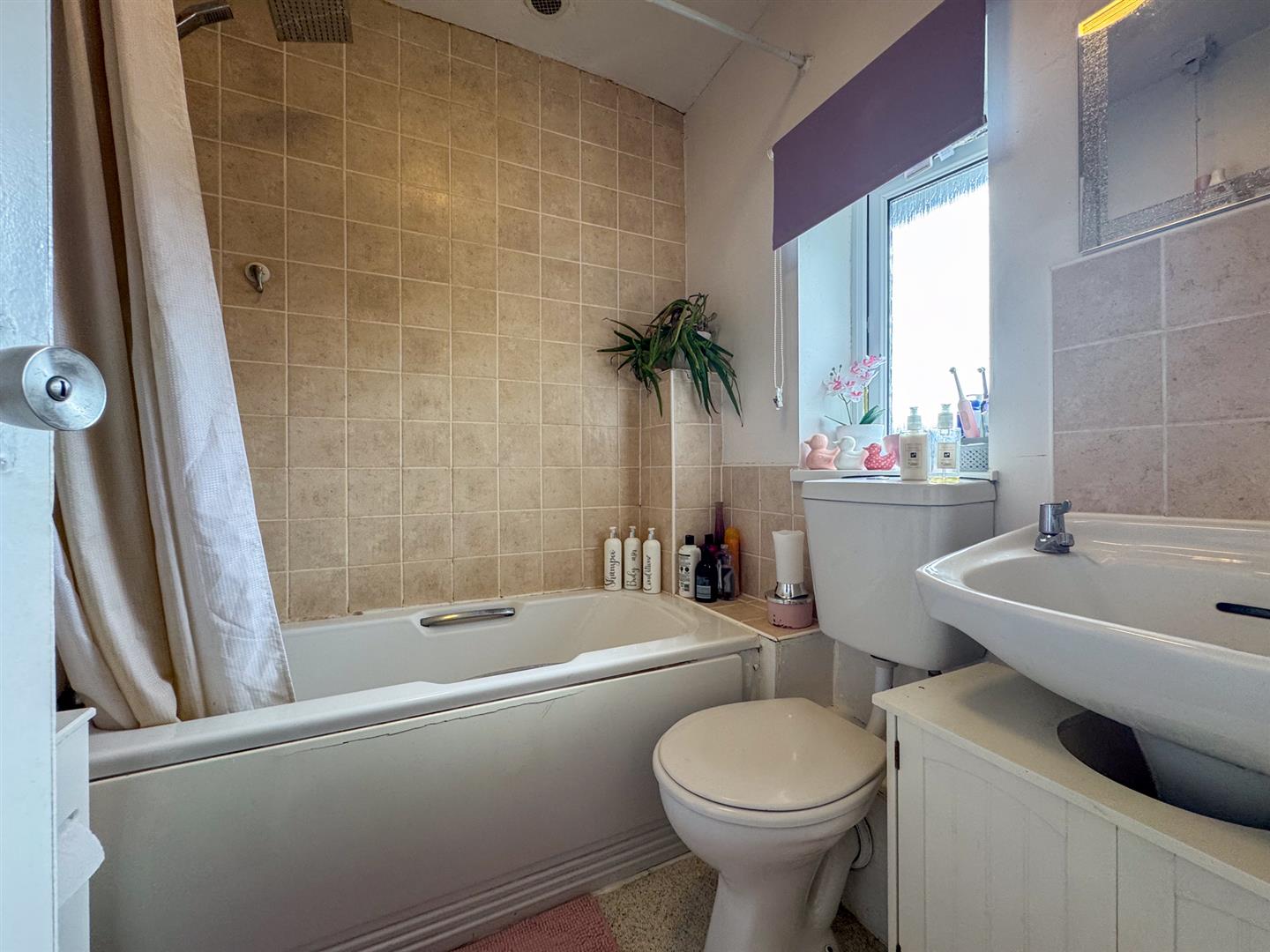 Upstairs, the property boasts three generously sized bedrooms, each offering flexible space for family living or working from home. The family bathroom comprises a fitted panel bath, pedestal wash basin, and low-level WC, finished with stone-effect tiling to splashback areas in a neutral style.