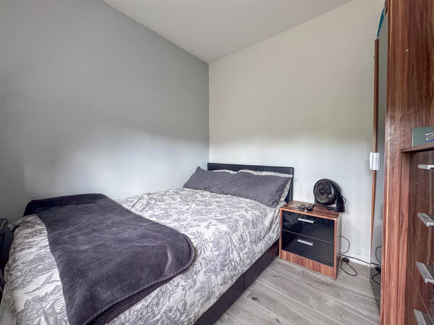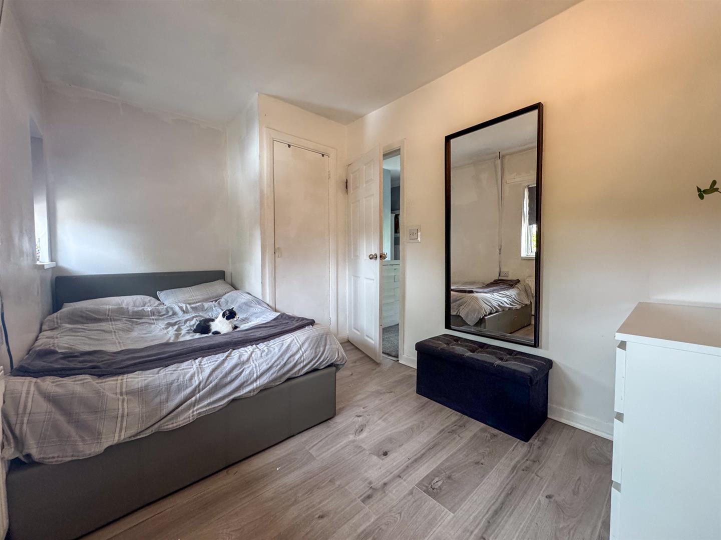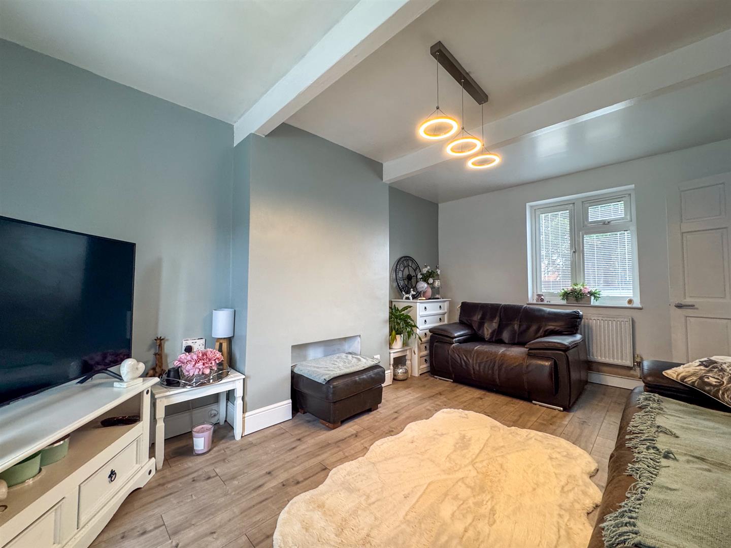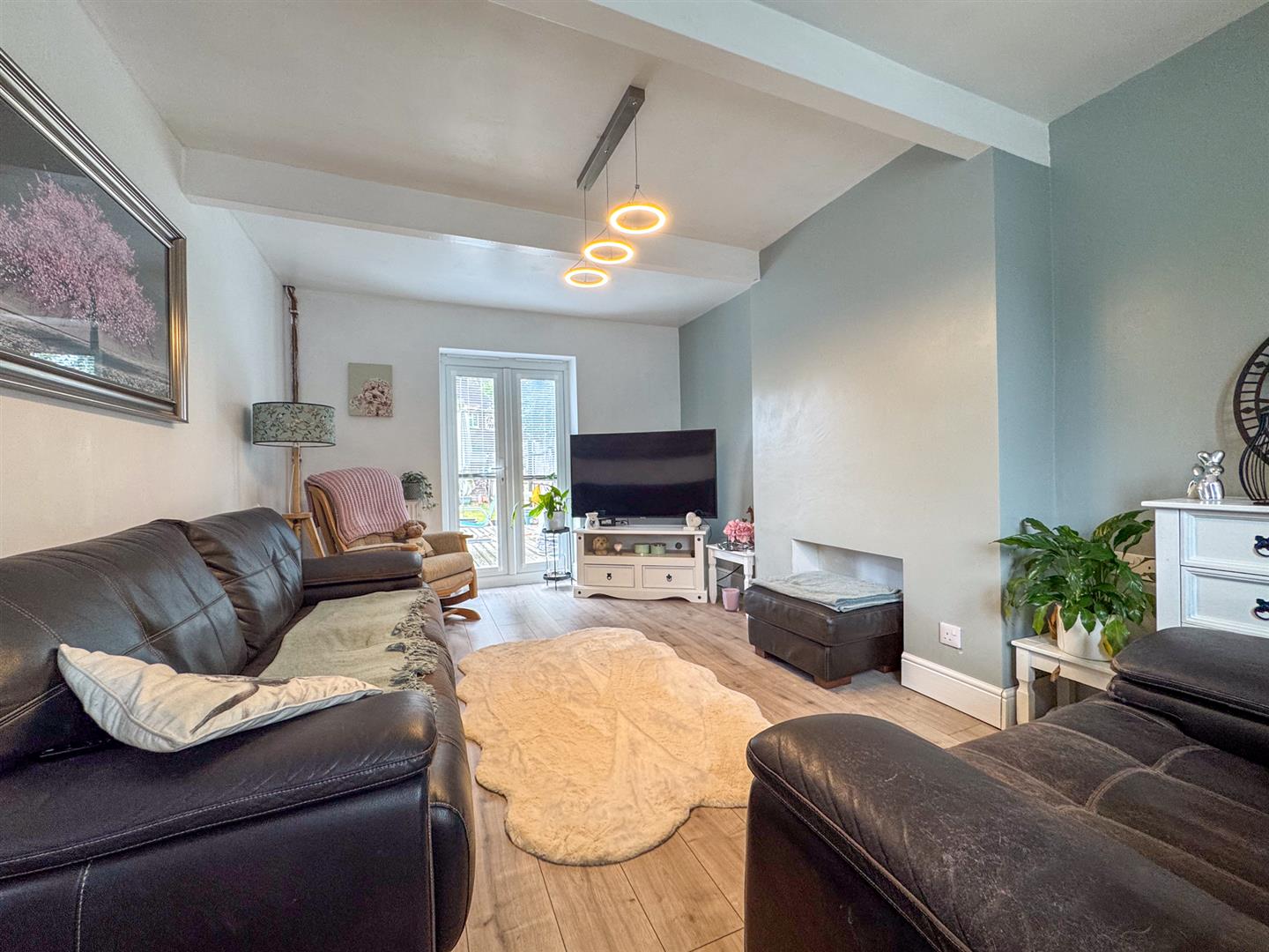 Stepping inside, the entrance hallway provides access to all principal rooms and the staircase to the first floor. To the right, the bright and spacious lounge benefits from a front-facing window and French doors opening directly onto the rear garden, creating a light and airy atmosphere. Tastefully decorated in neutral tones and finished with timber-effect laminate flooring, this room is perfect for both relaxing and entertaining.