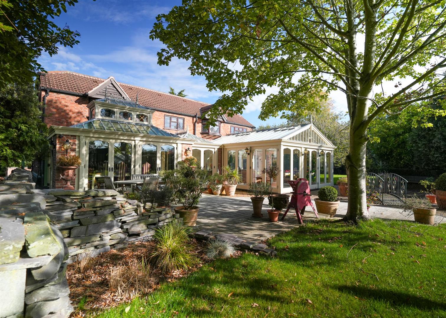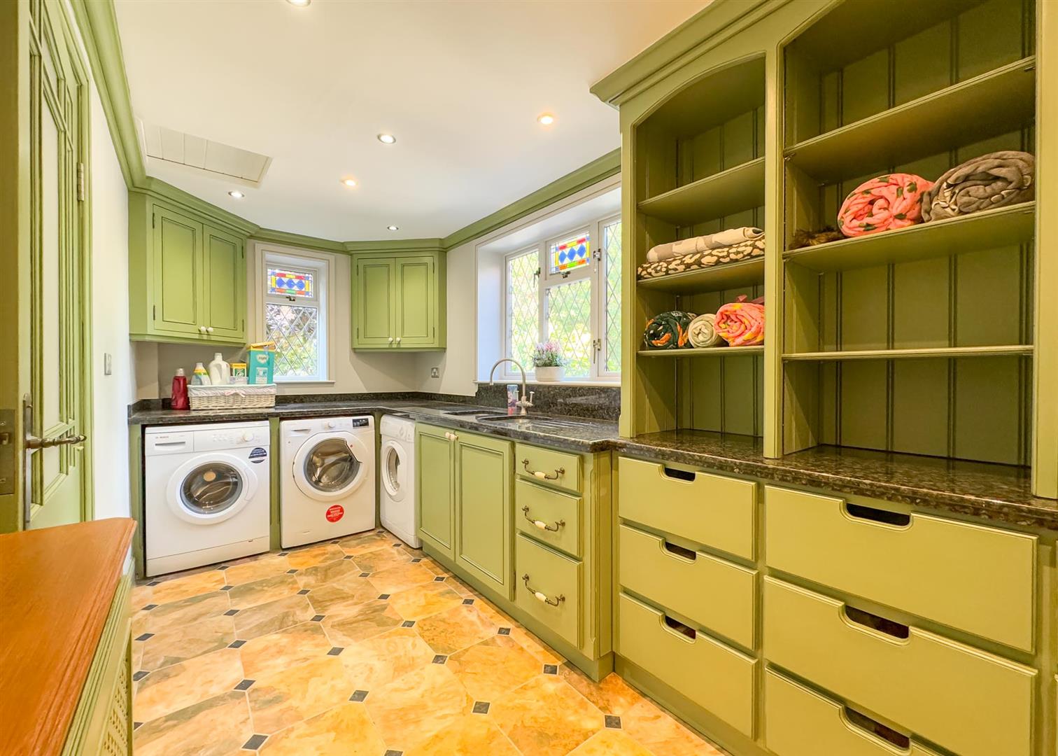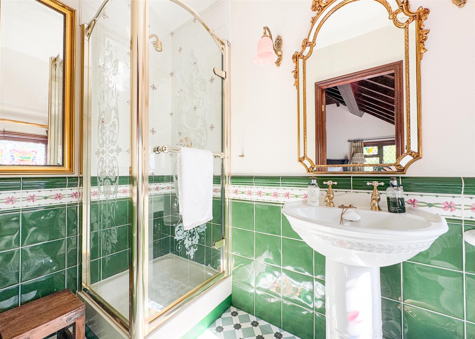 A detached, oversized double garage with annexe accommodation above provides exceptional flexibility — ideal for guests, extended family, or a home office suite. The annexe includes its own living space, kitchen, and shower room, finished to a high standard. Additionally, a fully fitted outbuilding, converted from a shipping container, provides further self-contained office or studio space.