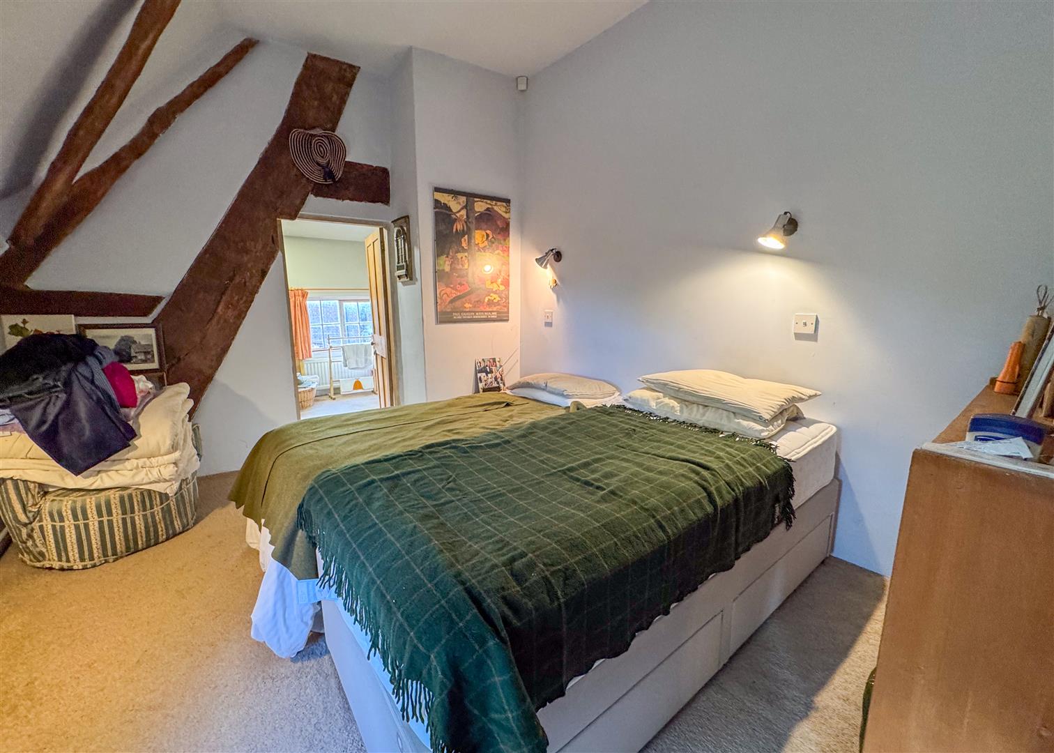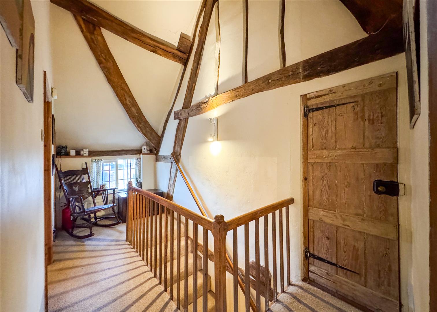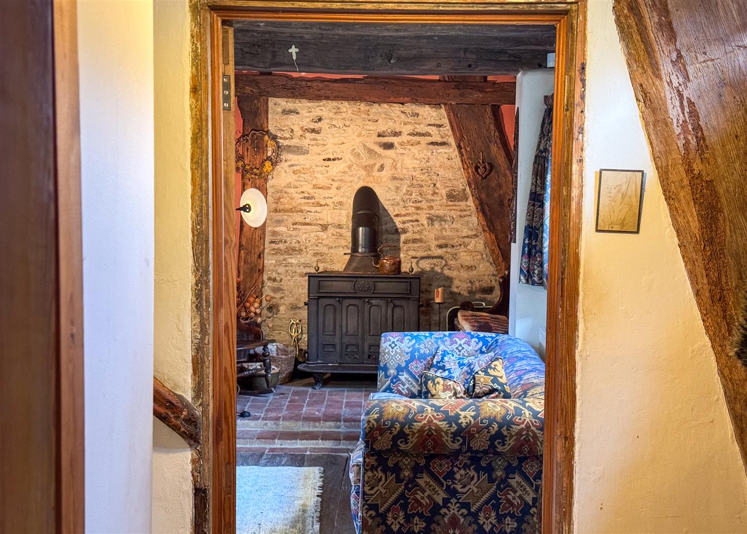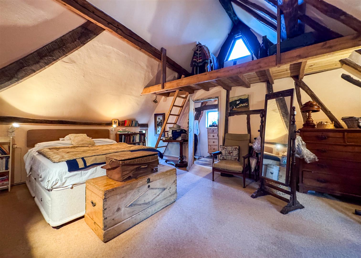 Inside, centuries of craftsmanship are immediately evident. The beautiful lounge is a standout feature, with exposed beams, original timberwork and a feature stone fireplace housing a log burning stove. It is a warm and atmospheric space, perfect for relaxed evenings by the fire. The ground floor also includes a welcoming dining room, a separate study, a charming country style kitchen, two bathrooms and a convenient downstairs WC, providing practical and flexible living for families or guests. Upstairs, the principal bedroom is a truly impressive space. Vaulted ceilings and ancient beams create a dramatic backdrop, while the unique mezzanine level adds versatility as a reading nook, dressing area or quiet workspace. Two additional bedrooms continue the theme of character and charm, each enjoying views across the gardens.