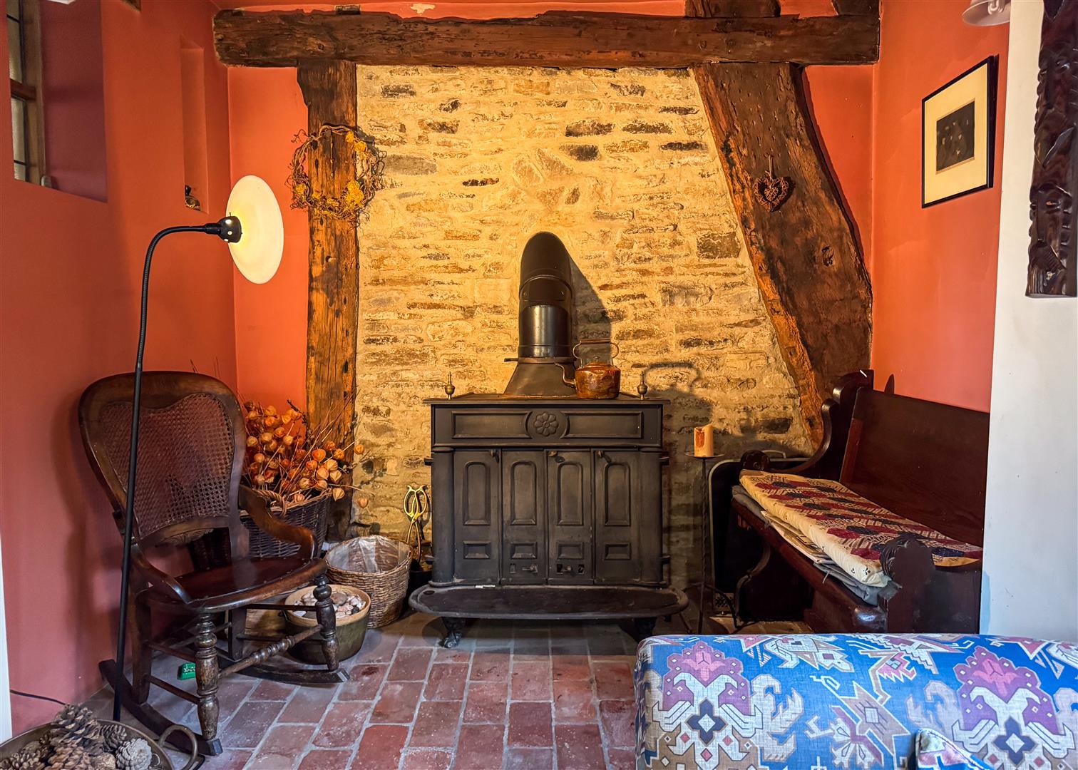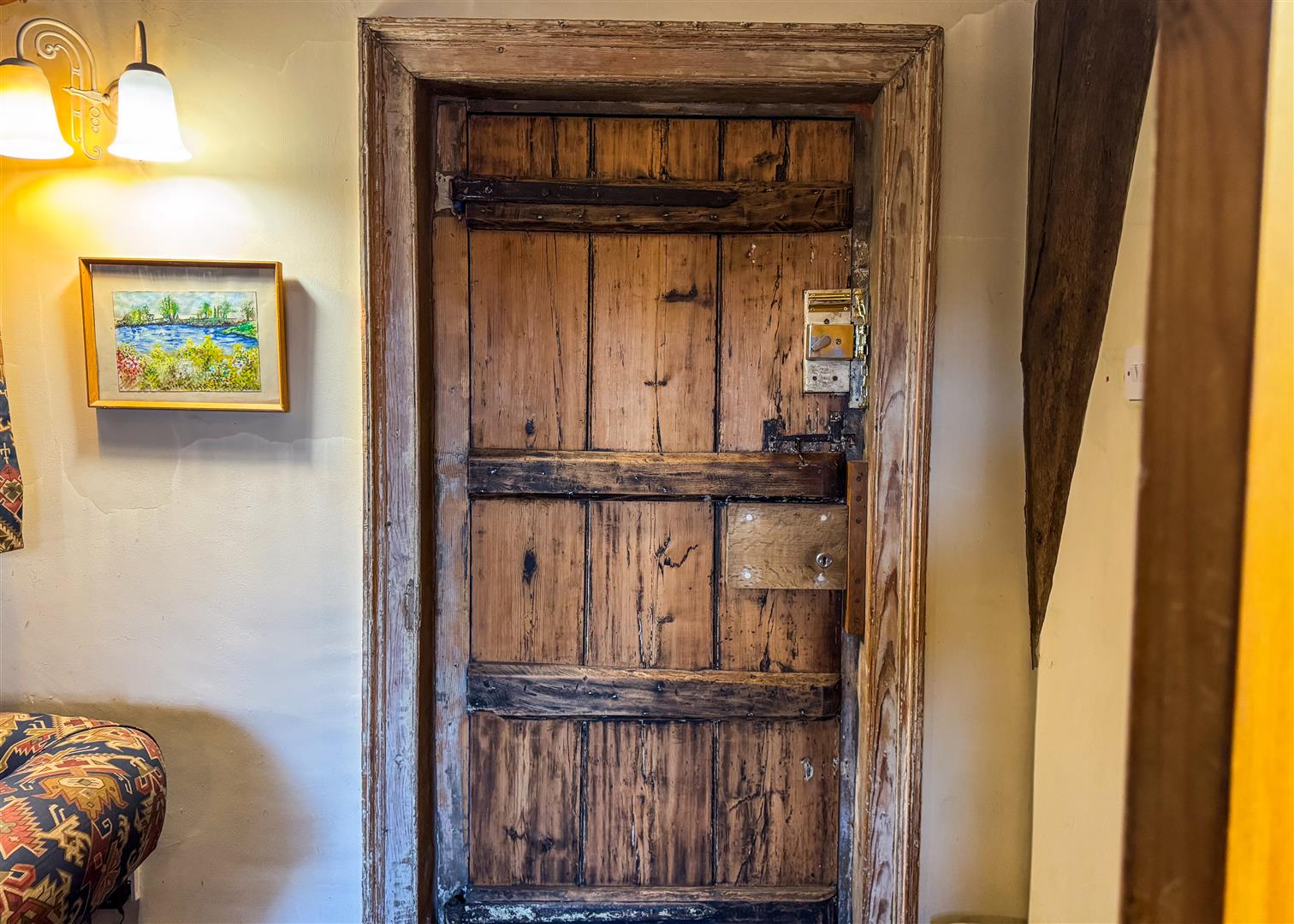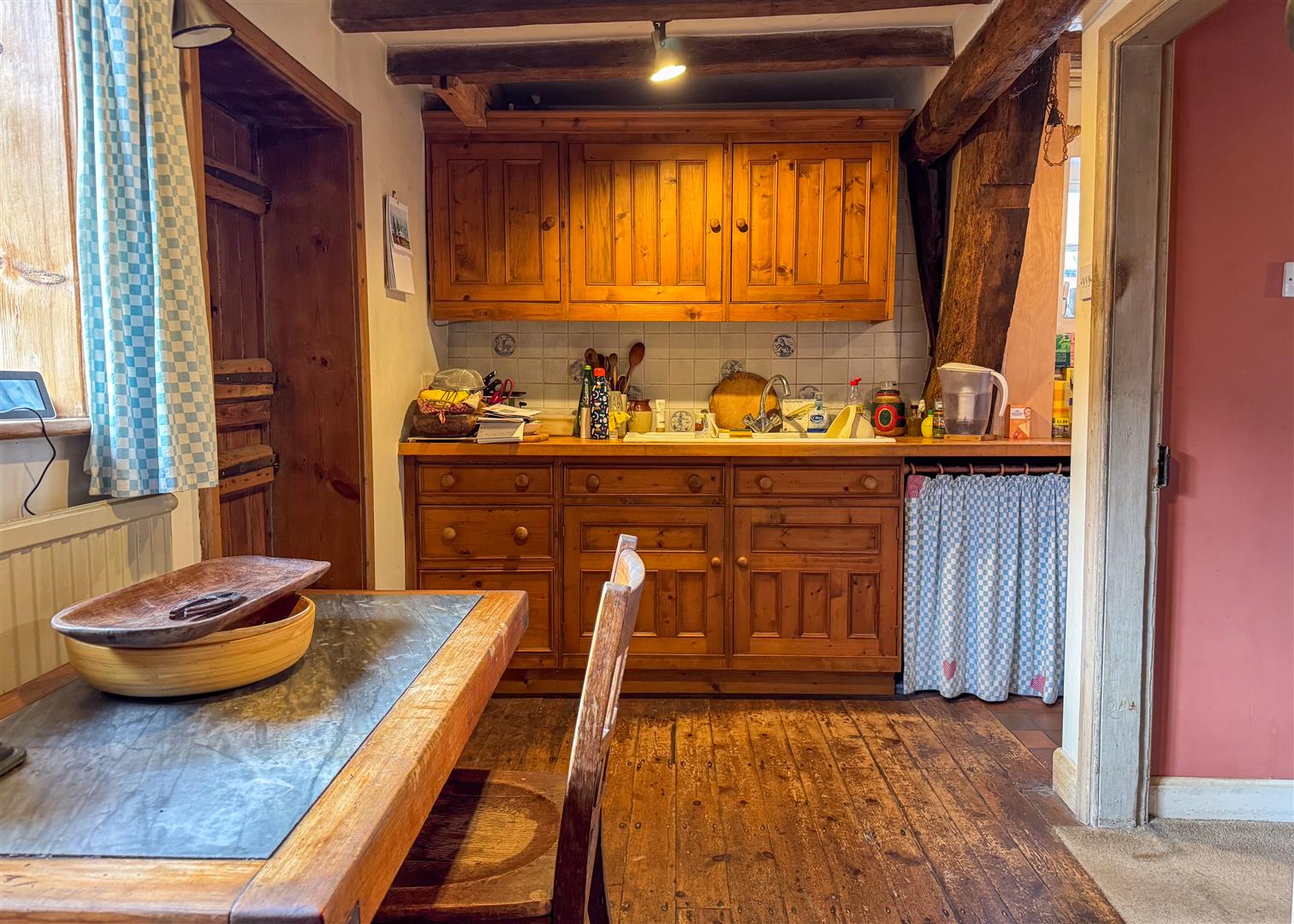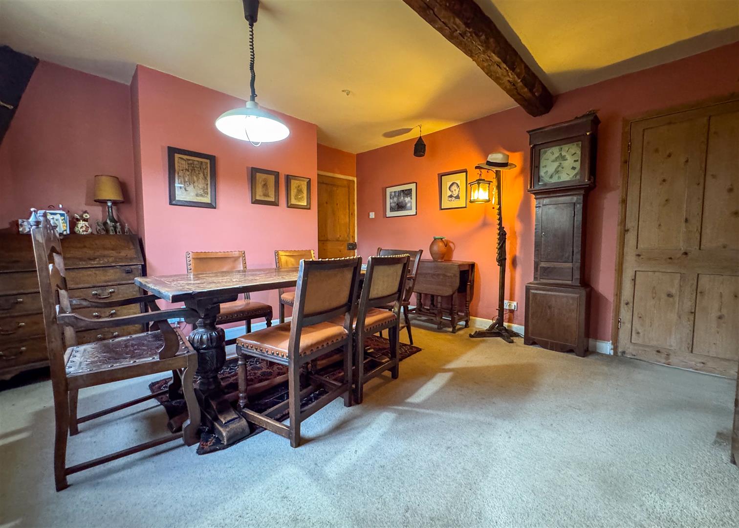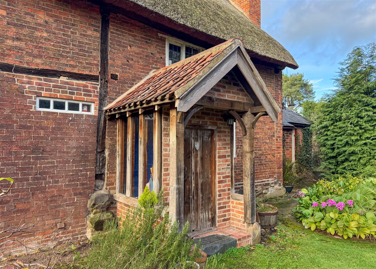 Inside, centuries of craftsmanship are immediately evident. The beautiful lounge is a standout feature, with exposed beams, original timberwork and a feature stone fireplace housing a log burning stove. It is a warm and atmospheric space, perfect for relaxed evenings by the fire. The ground floor also includes a welcoming dining room, a separate study, a charming country style kitchen, two bathrooms and a convenient downstairs WC, providing practical and flexible living for families or guests. Upstairs, the principal bedroom is a truly impressive space. Vaulted ceilings and ancient beams create a dramatic backdrop, while the unique mezzanine level adds versatility as a reading nook, dressing area or quiet workspace. Two additional bedrooms continue the theme of character and charm, each enjoying views across the gardens.