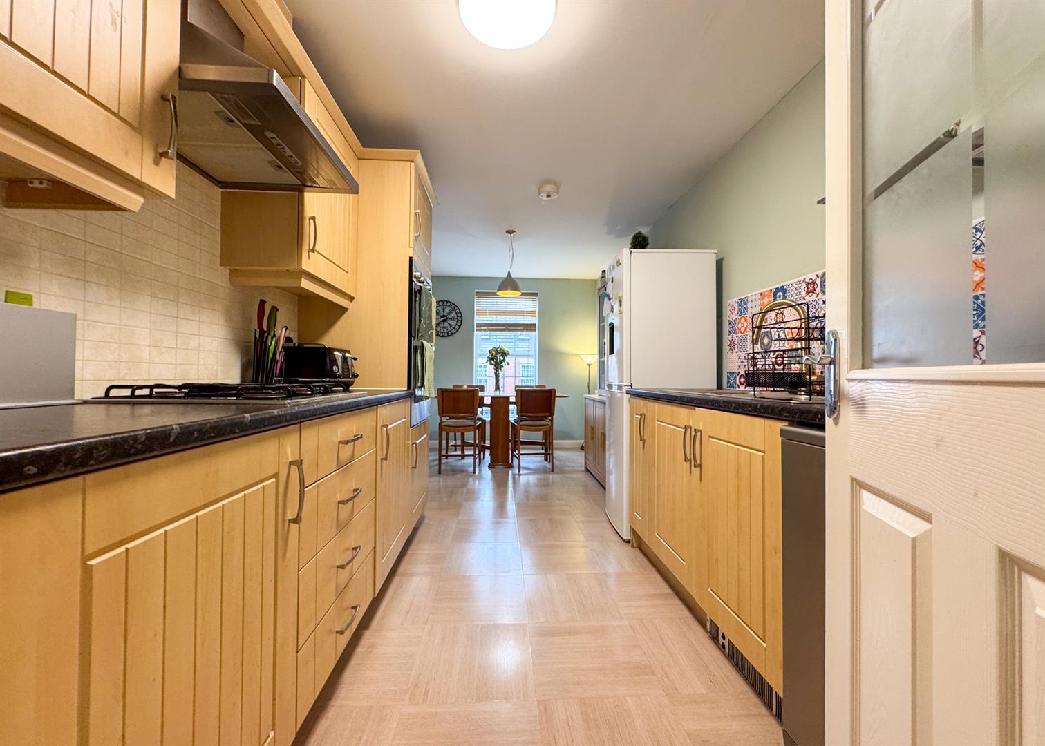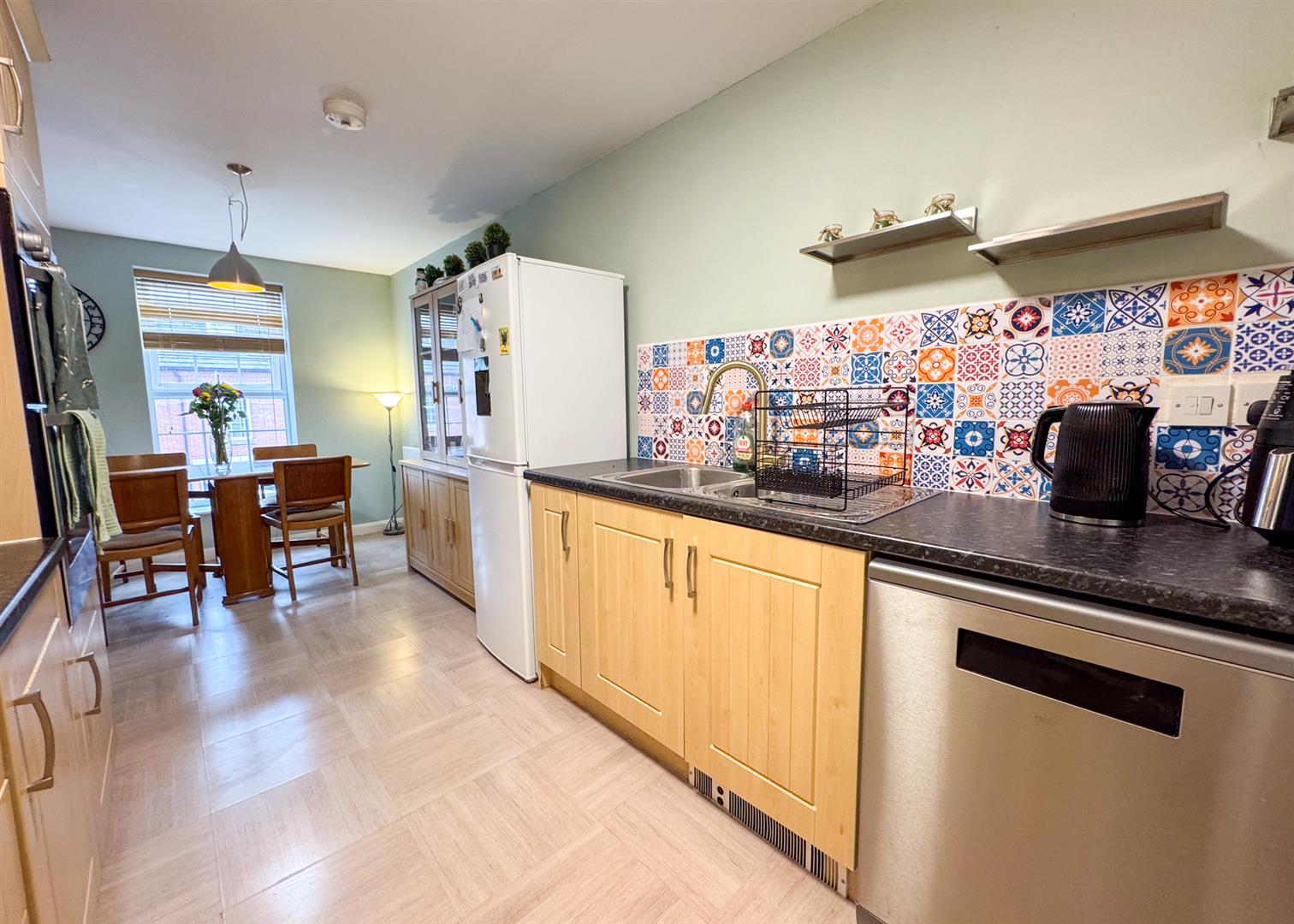 The first floor is home to a spacious sitting room (5.00m x 3.45m / 16'5 x 11'4) and a fully fitted kitchen/dining room (5.51m x 2.46m max / 18'1 x 8'1 max) complete with integrated appliances and ample worktop space. A separate living area (2.18m x 2.11m / 7'2 x 6'11) adjacent to the kitchen further enhances the sociable layout.